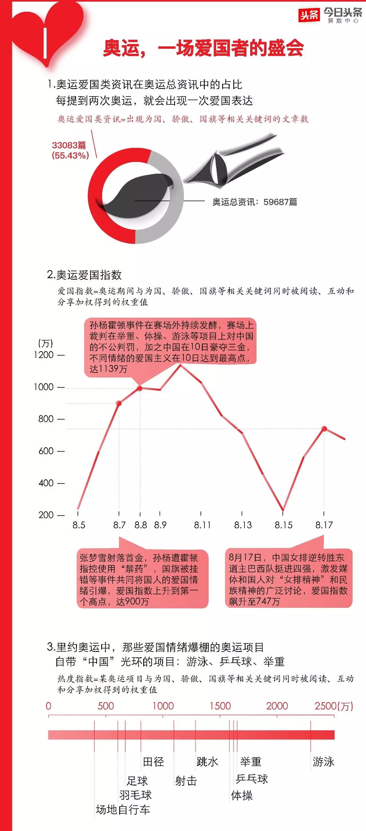 本届里约奥运会逐渐进入尾声,今日头条大数据基于5.3亿用户数据,独家发布“奥运爱国指数”,以大数据测量本次奥运中多面复杂的爱国主义,描绘奥运爱国者的脸谱。