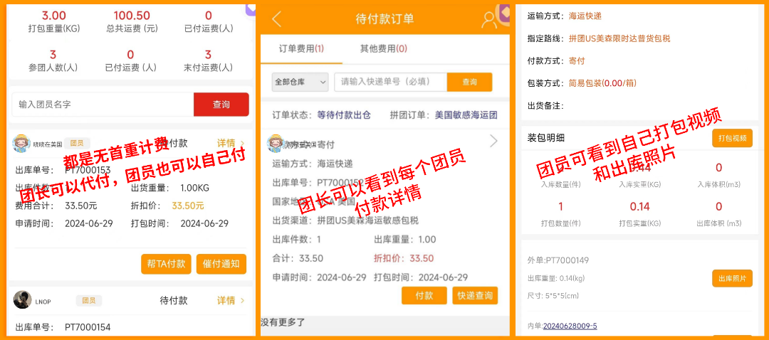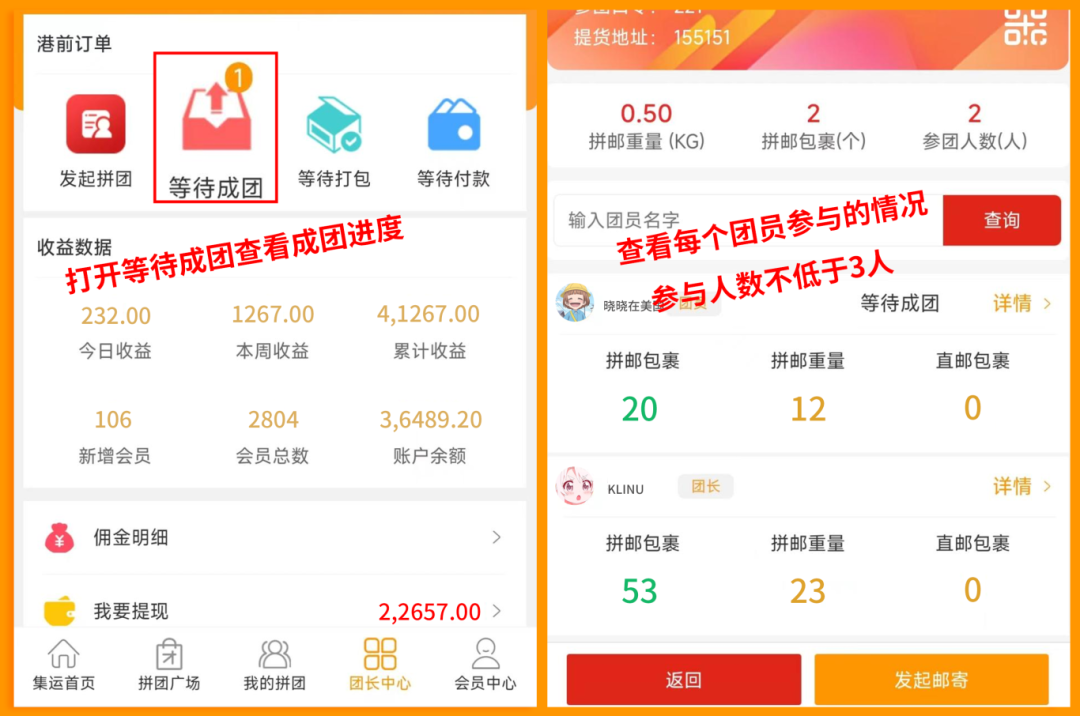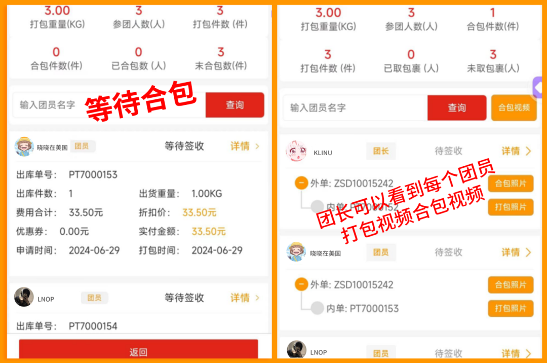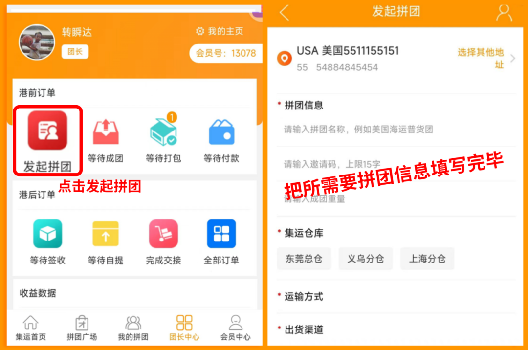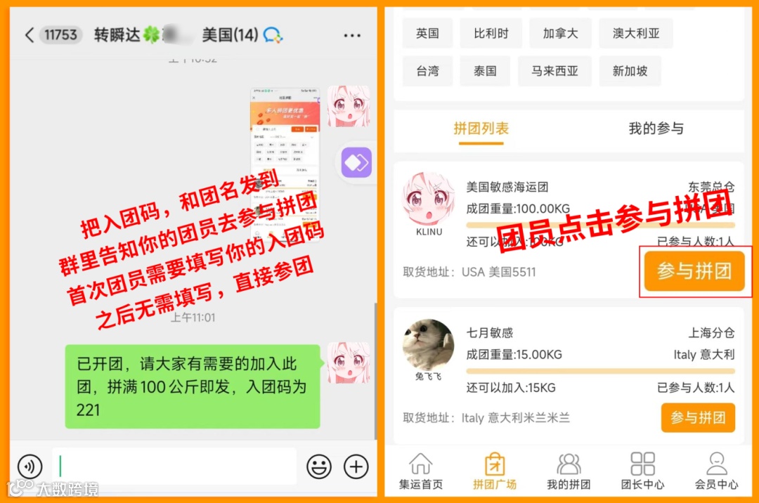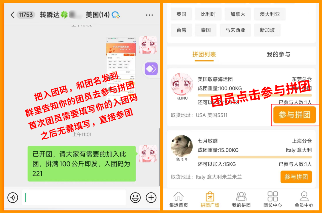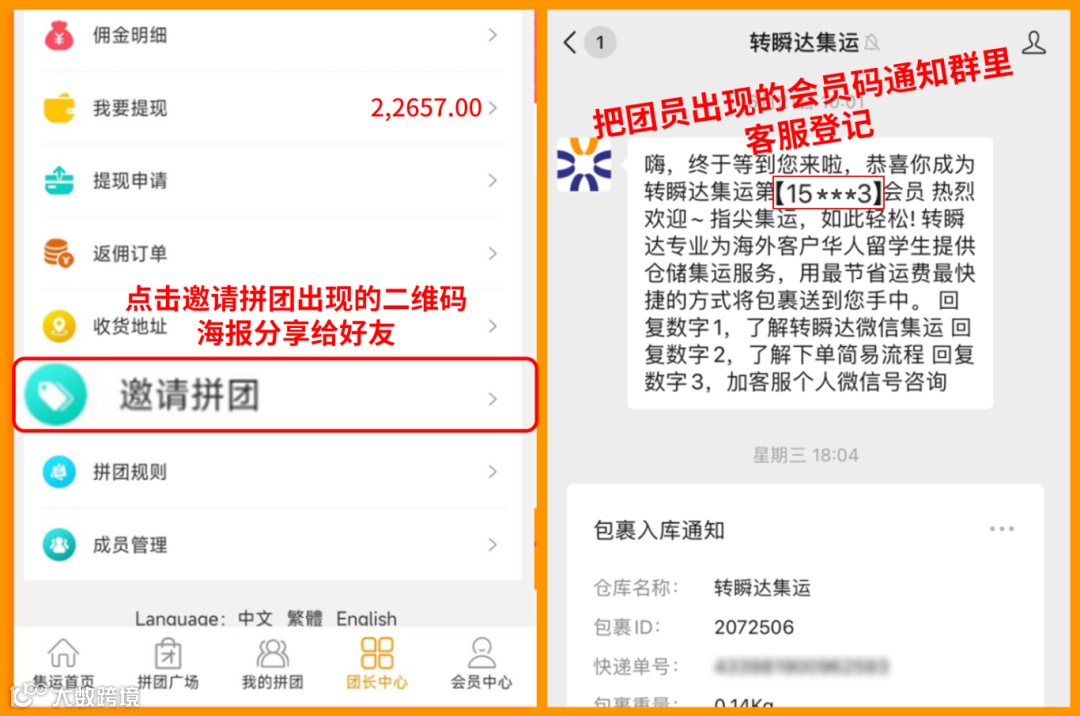 PS:对于想自己维护客户的团长,只需要和我们客服说开通特殊团长帐号,每次有新成员加入需要客服帮您开通团员帐号,您只需要把带有转瞬达会员号的仓库地址给团员即可,团员包裹到仓后不需要团员本人操作参团,系统会自动完成所有成员参团,您可以在团长页面看到所有团员在仓包裹, 想添加谁订单进去某个团都能操作,非常的方便~!