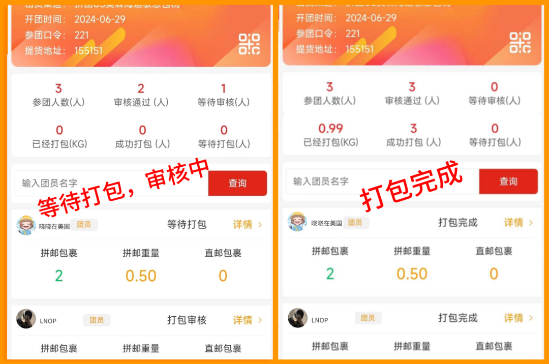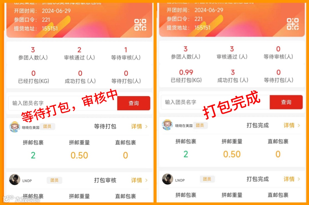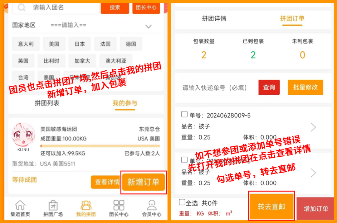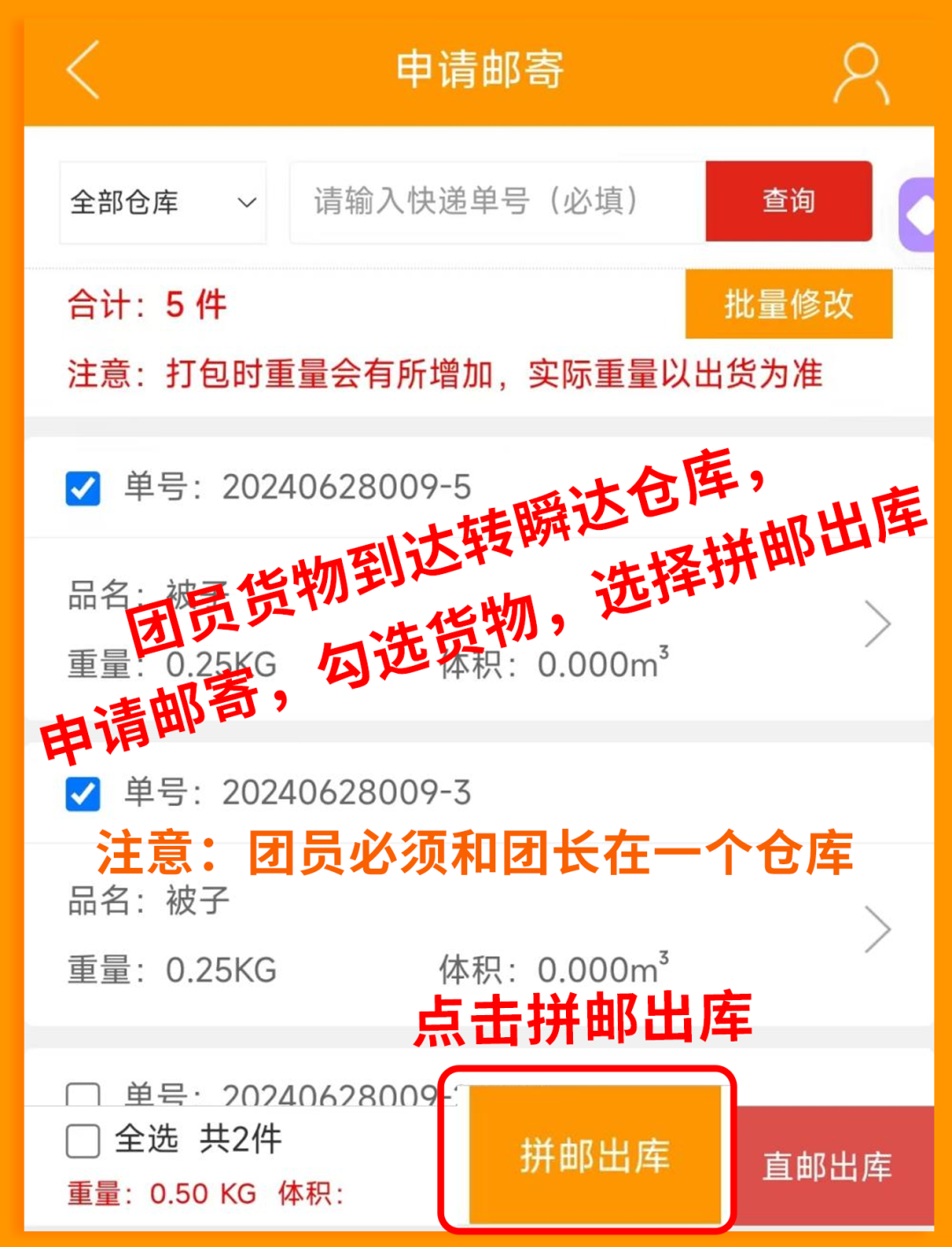 团员的货物到仓后,可打开会员中心申请邮寄页面,勾选已入库的单号点拼邮出库,选择参与的团即可加入订单,可以边到货边加入,只要此团没邮寄,不限加入次数。