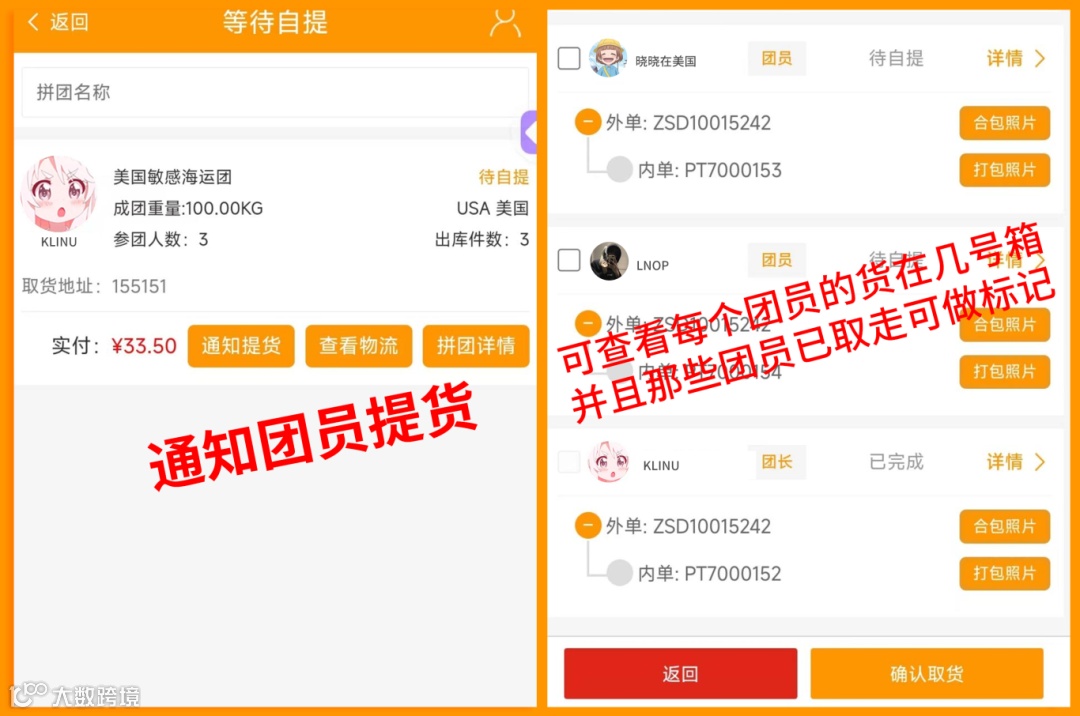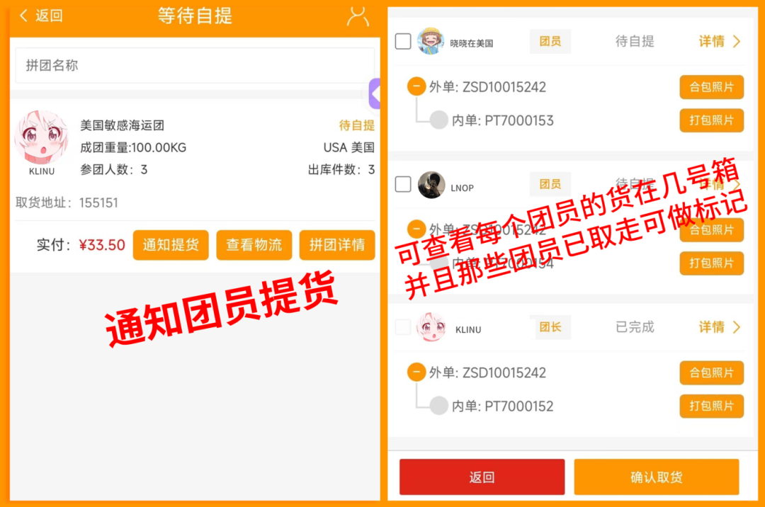 包裹到达团长家后,系统立马自动通知每位团员提货,团长也可以系统一健再次催促提醒,此时在团长中心等待提货页面,也可以清楚的看每个团员的货在第几号箱并有外观照片,并且那些团员已取走可做标记