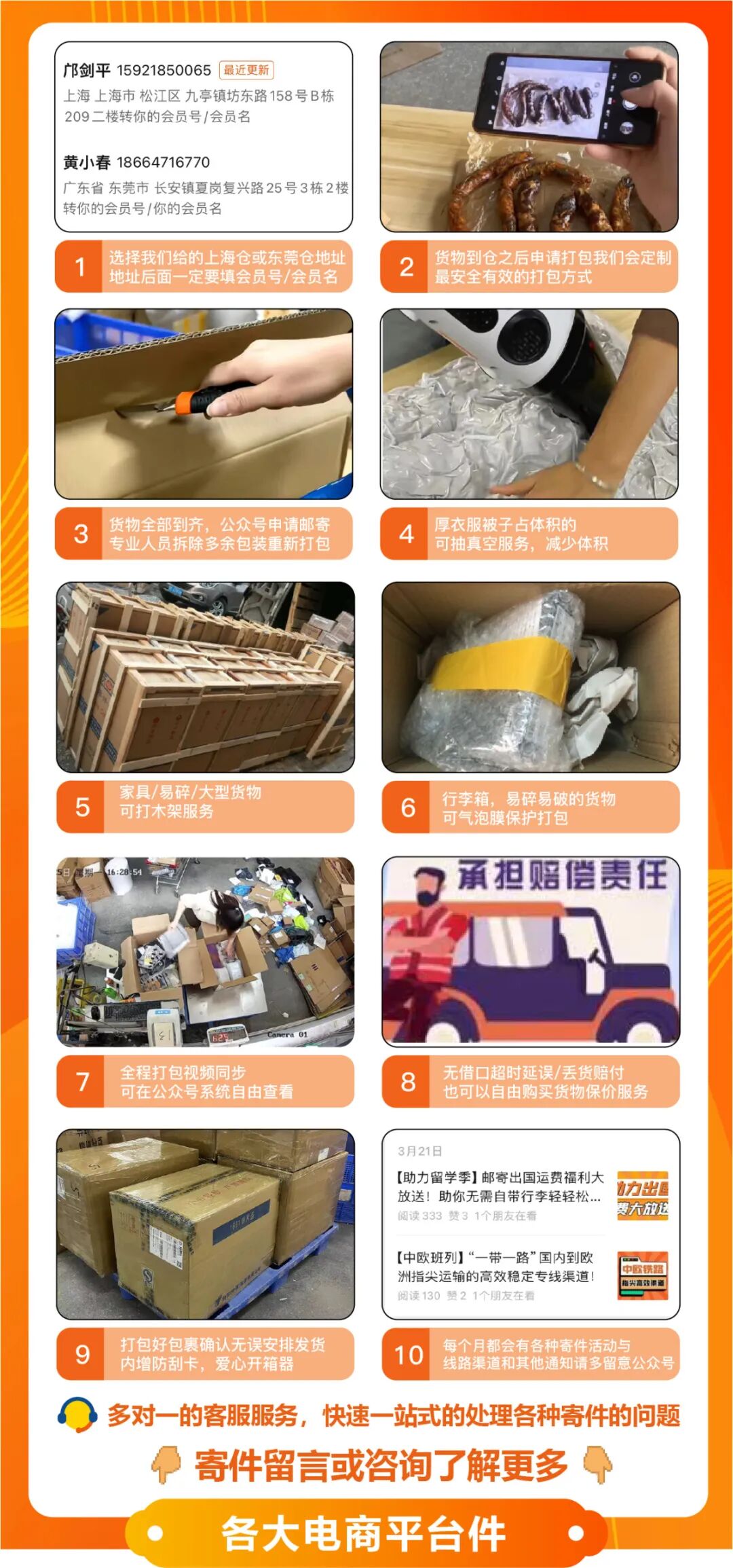 为了方便您从江浙沪皖地区邮寄出国更便捷,更省钱,更省力,更高效,即可预约上海仓免费上门取件,广东省内的邮寄出国的可预约东莞仓免费上门取件;