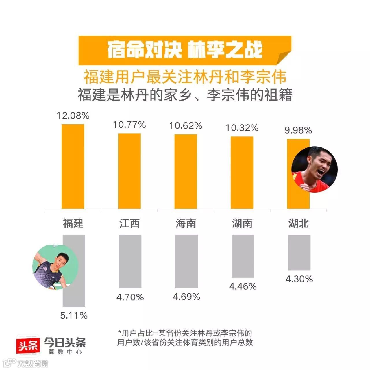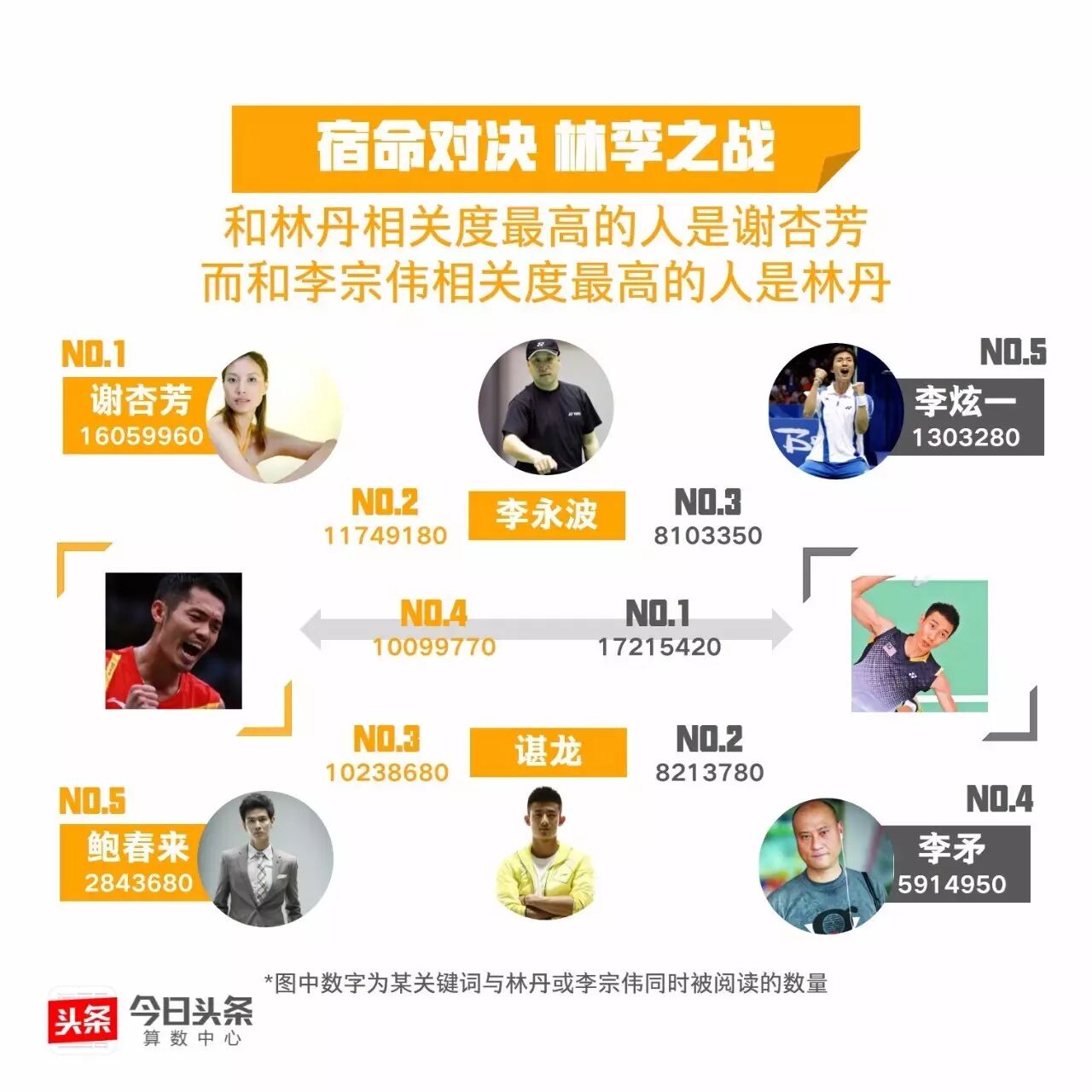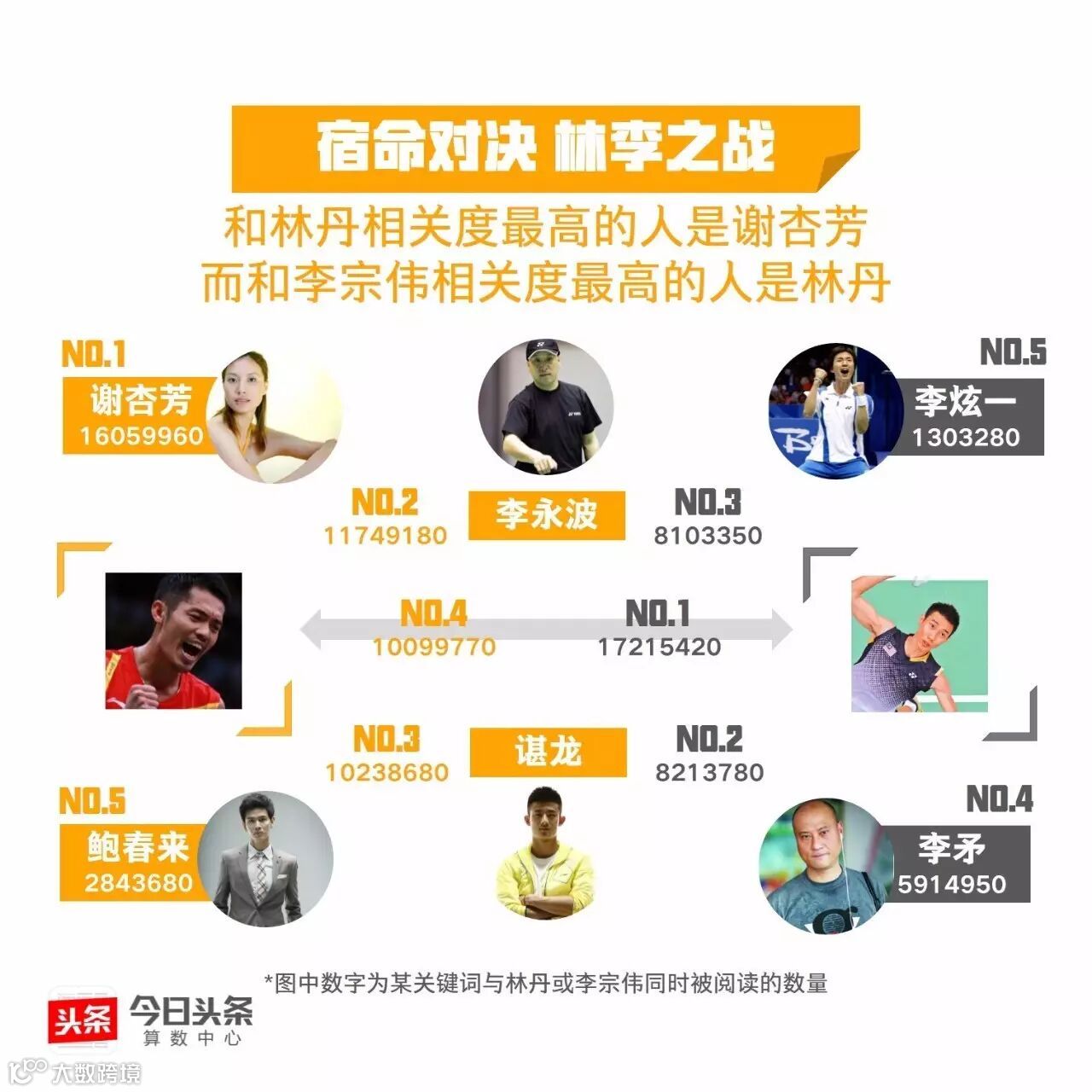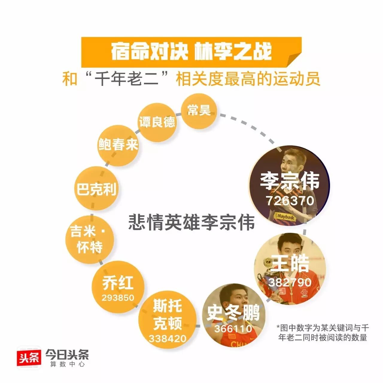 继丁宁李晓霞、马龙张继科的王者对决后,今日头条从大数据的视角带你“数观”又一场巅峰对战。数据显示,李宗伟是与“千年老二”相关度最高的运动员,这位悲情英雄能否在里约挑落“超级丹”呢?我们与你一起拭目以待!