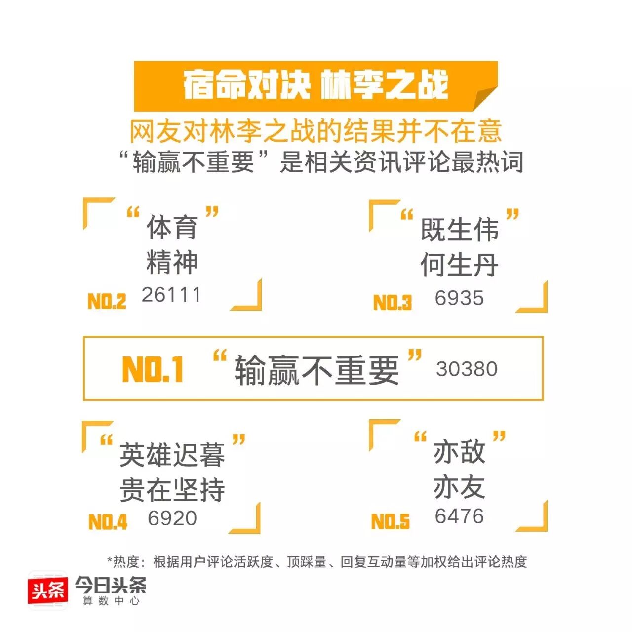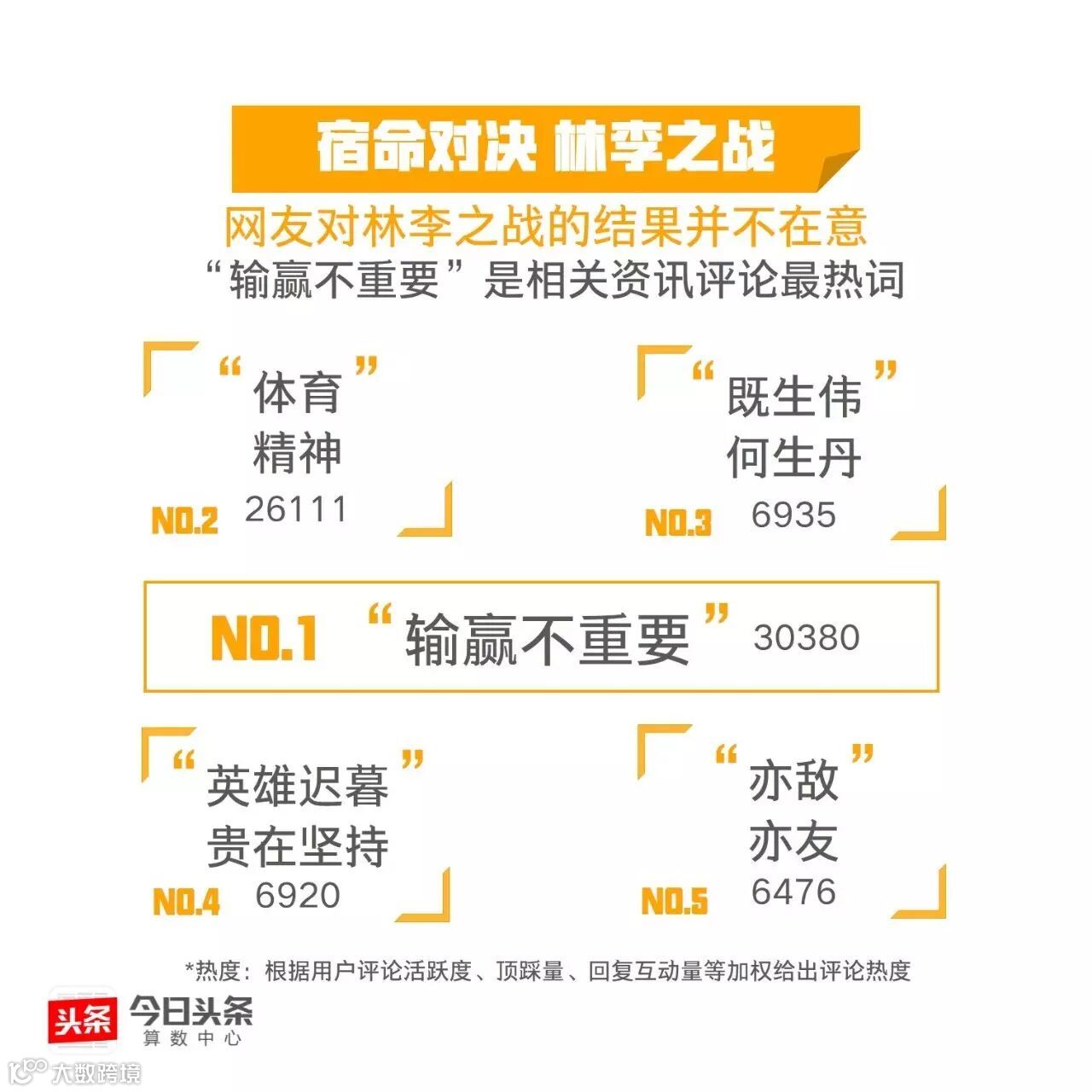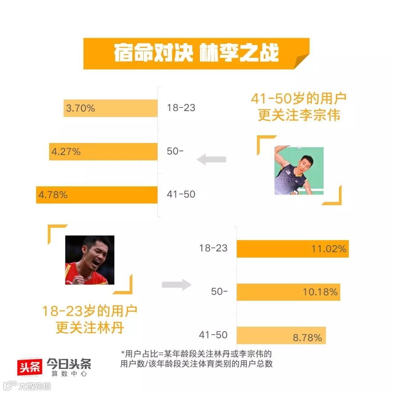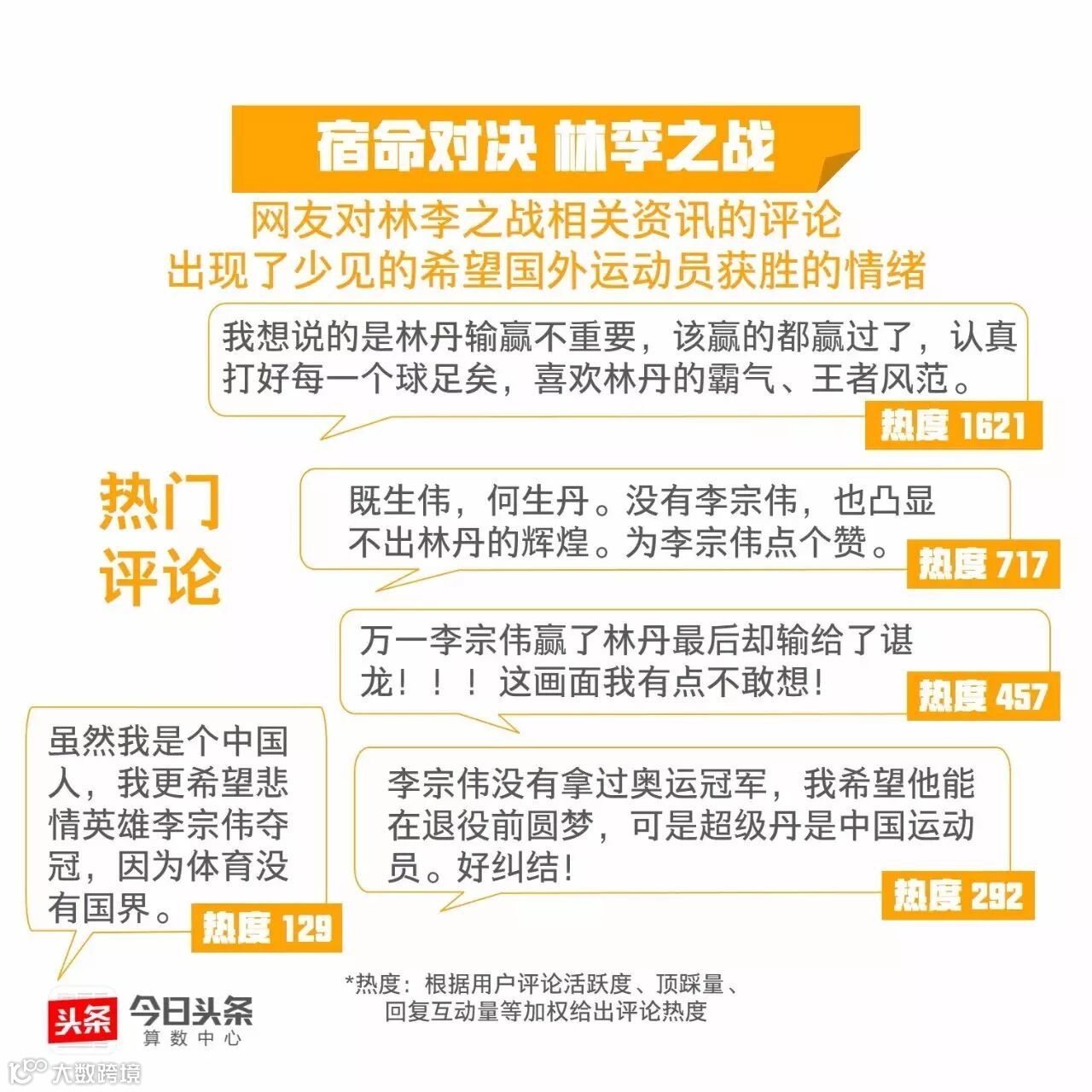 继丁宁李晓霞、马龙张继科的王者对决后,今日头条从大数据的视角带你“数观”又一场巅峰对战。数据显示,李宗伟是与“千年老二”相关度最高的运动员,这位悲情英雄能否在里约挑落“超级丹”呢?我们与你一起拭目以待!