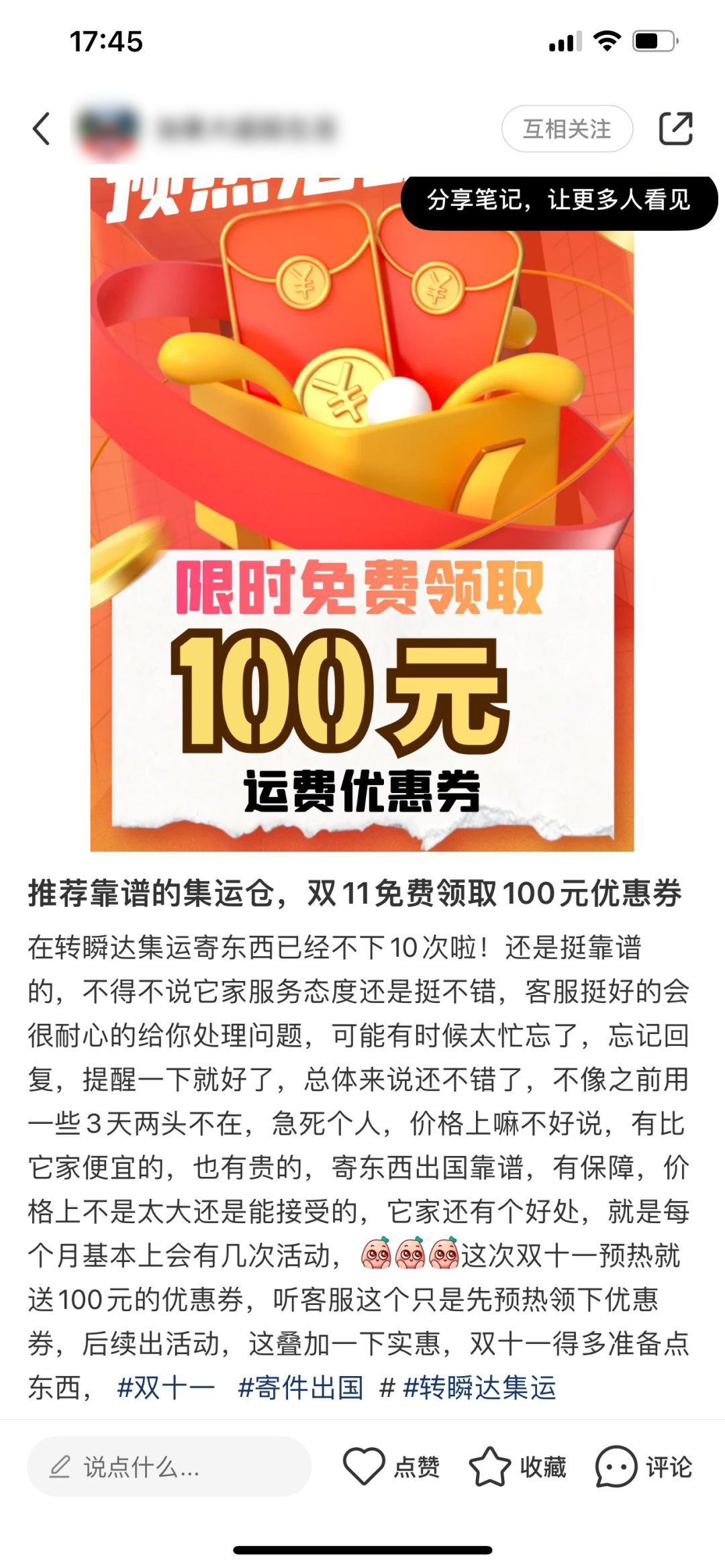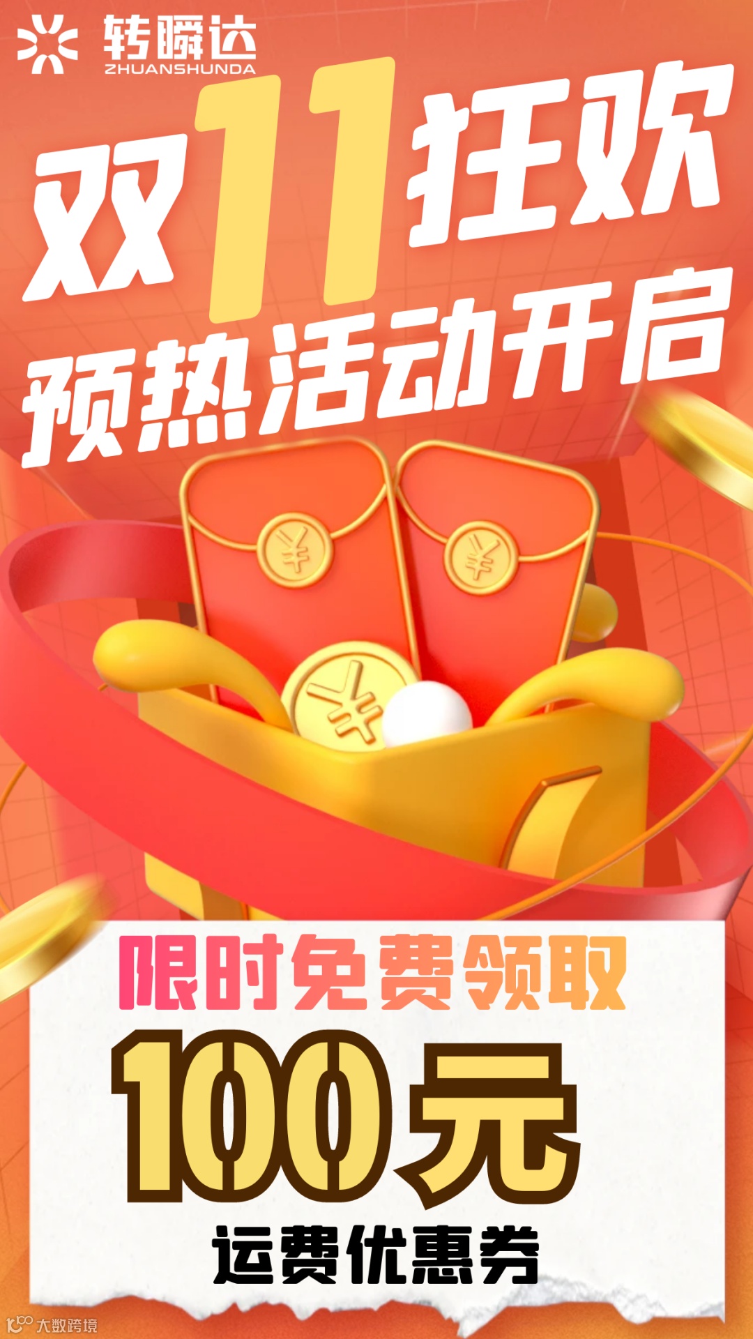 第三种:分享活动海报以“转瞬达集运”为主题到小红书或抖音上。24小时后截图给客服即可获得双十一100元优惠券满888即可使用