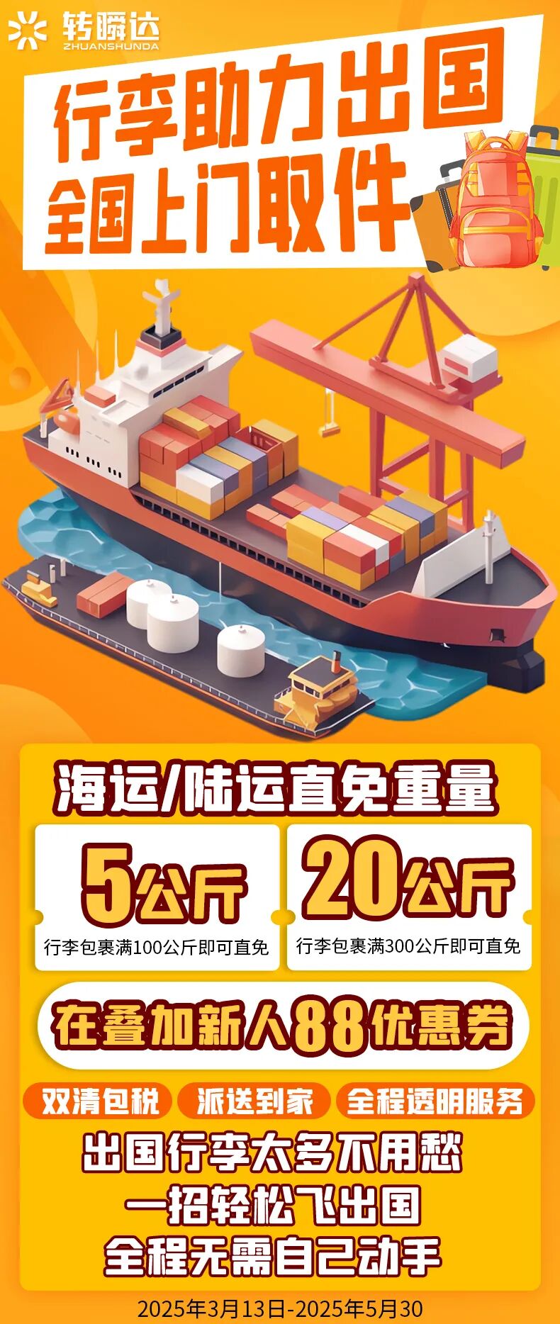 活动规则:在活动期间邮寄行李出国,可参与一次重量直减最高可达20公斤,还能叠加使用88元新人优惠券;联系客服参与活动,(此篇活动只限行李包裹,不与任何活动同时参与,只限于欧、美、加、英、新西兰、澳洲国家参与此活动;)
