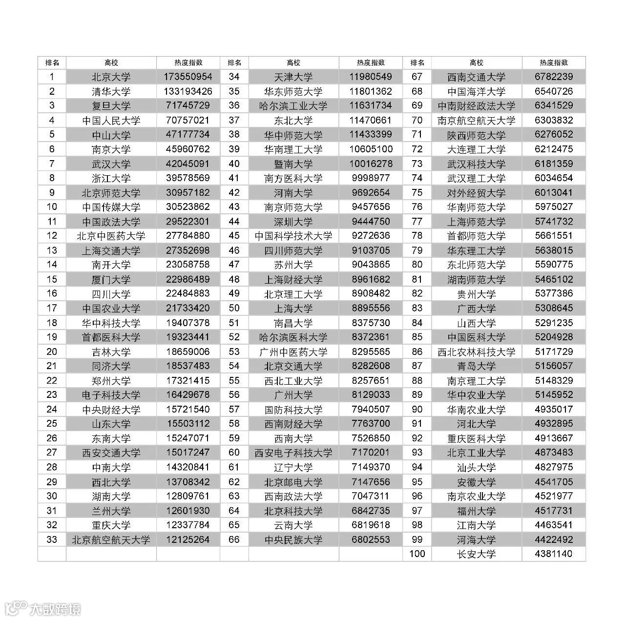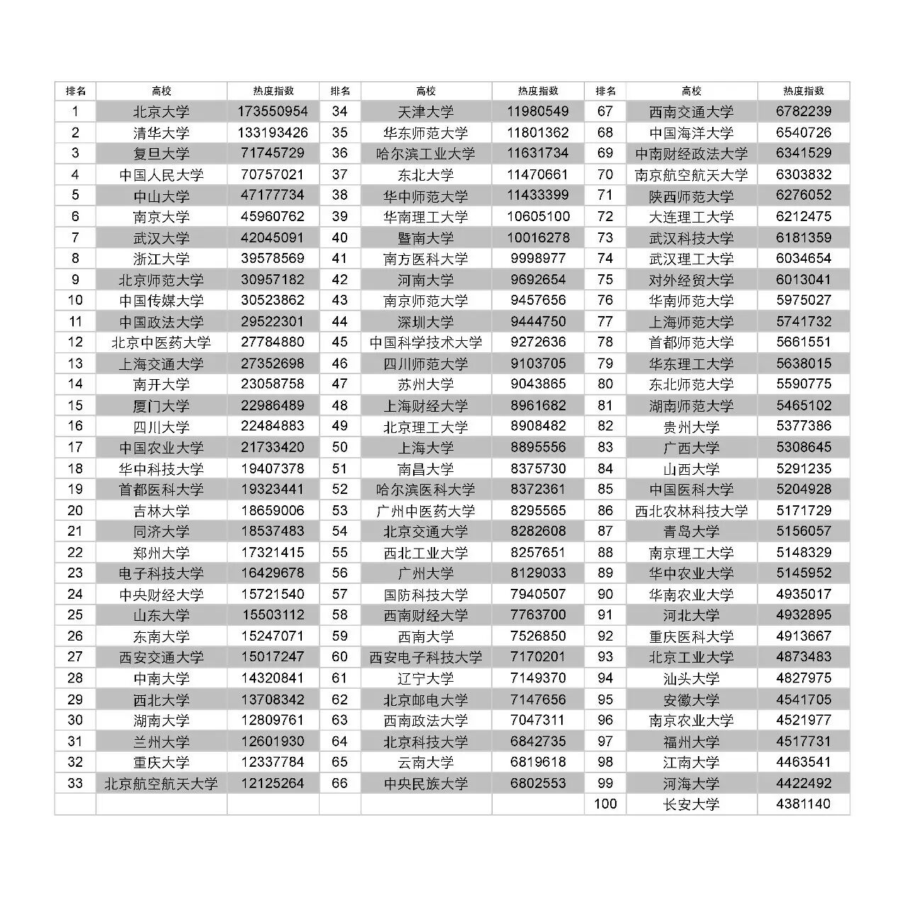 与以往依据大学在师资力量、学术水平、学科数量、媒体影响等方面进行量化评鉴不同,此次2016今日头条版中国大学热度排名制定规则较为独特,是依据全部今日头条用户在今日头条上对各高校相关文章内容的阅读情况,综合阅读量、评论情况、分享情况、点赞量等数据作出的加权热度指数,从而更加直接的反映高校的社会影响力、舆论话题制造力。