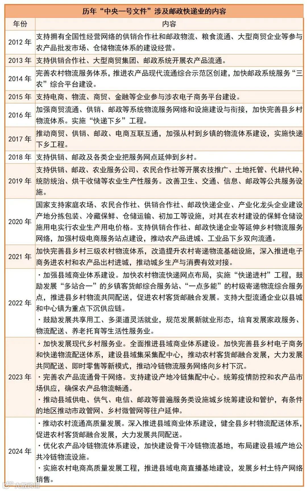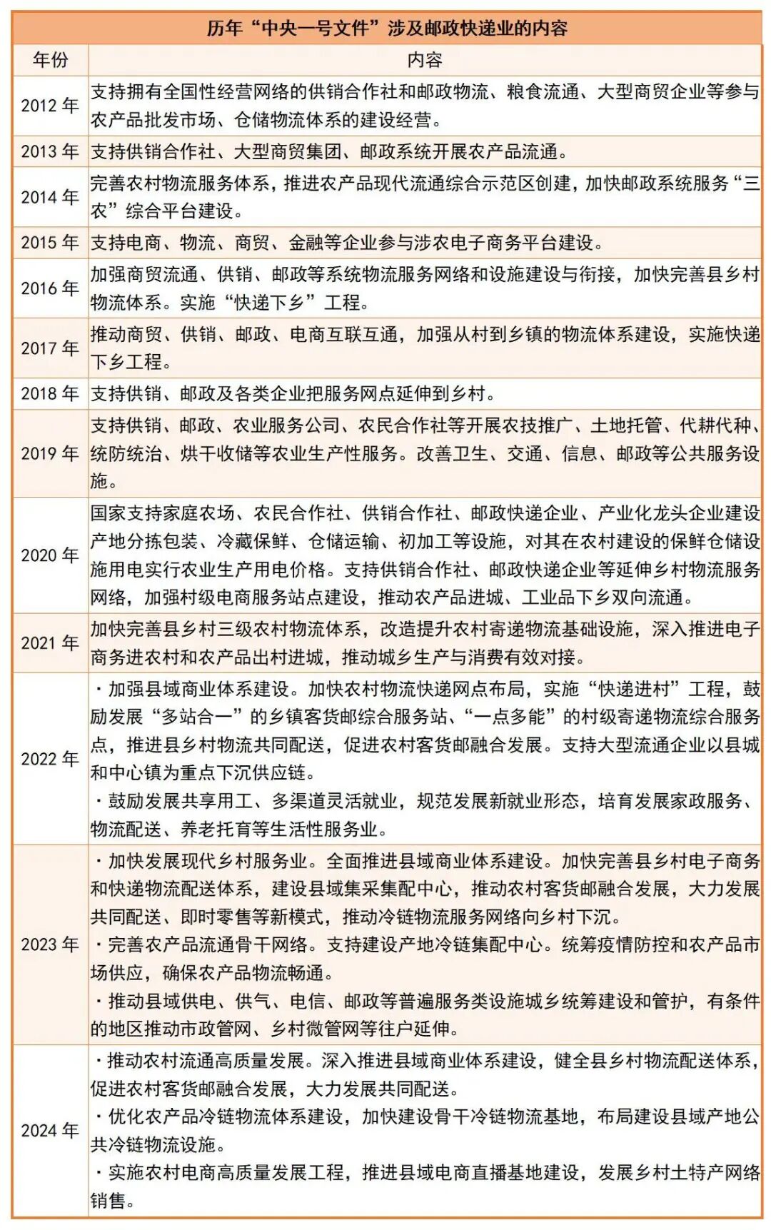 2月3日,《中共中央国务院关于学习运用“千村示范、万村整治”工程经验有力有效推进乡村全面振兴的意见》,即2024年中央一号文件正式发布。这是党的十八大以来,中央连续出台的第12个指导三农工作的一号文件,再次发出重农强农的强烈信号。这也是党的十八大以来,邮政快递业相关内容连续12年被写入中央一号文件,为行业服务“三农”发展再一次指明了方向。