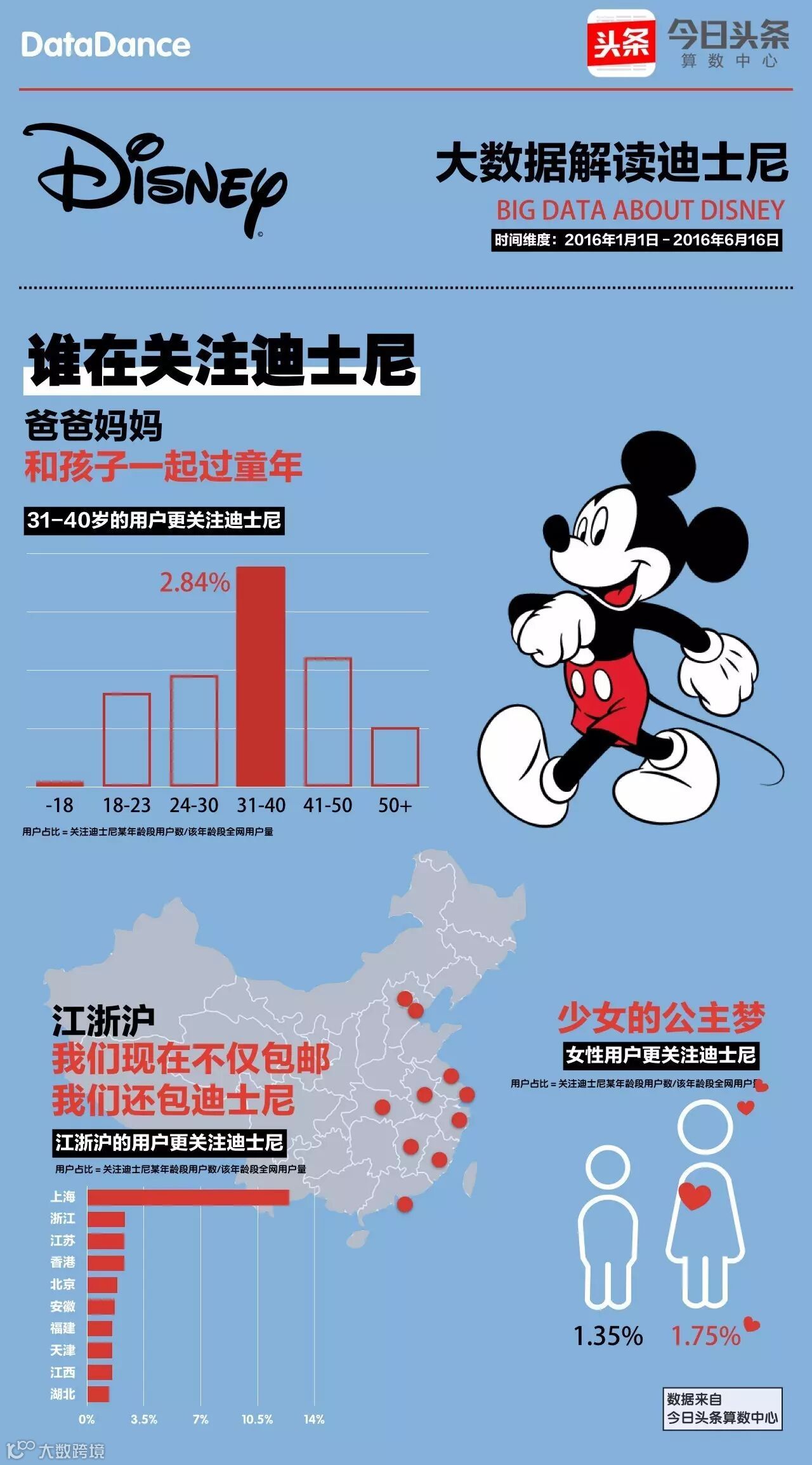 在用户年龄统计里,相比24-30岁的“小年轻”,31-40岁的用户更关注迪士尼。或许有了孩子的父母,都想带宝宝去迪士尼体验一番吧!