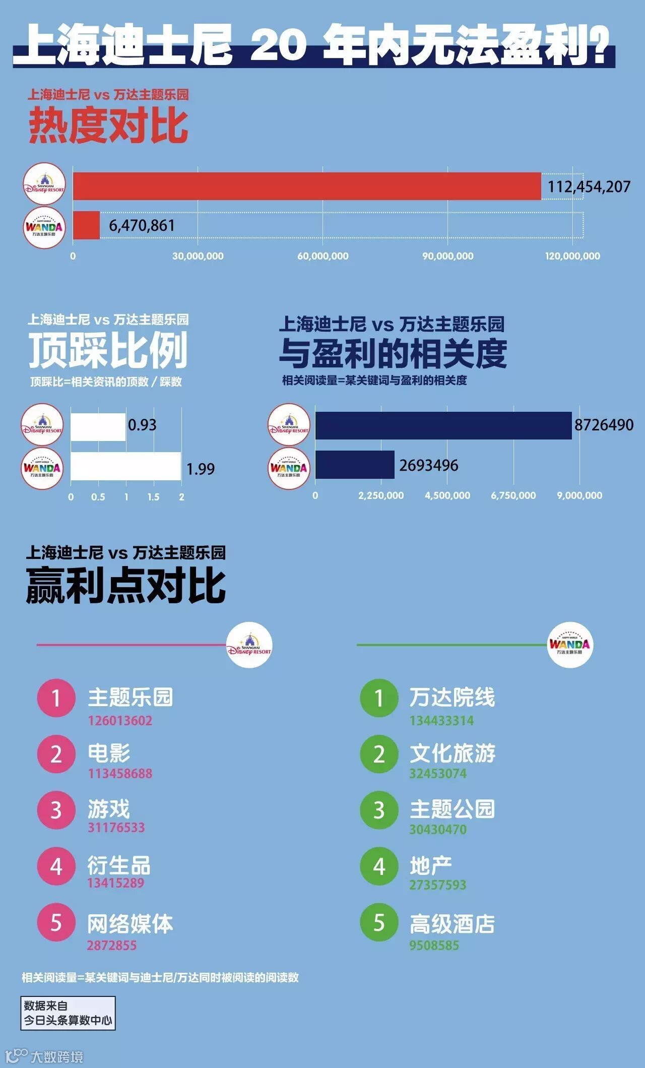 而头条用户的数据显示,对迪士尼的关注度远超万达的主题乐园。不过在用户的顶踩比里,万达还是赢得了相对多的好感。