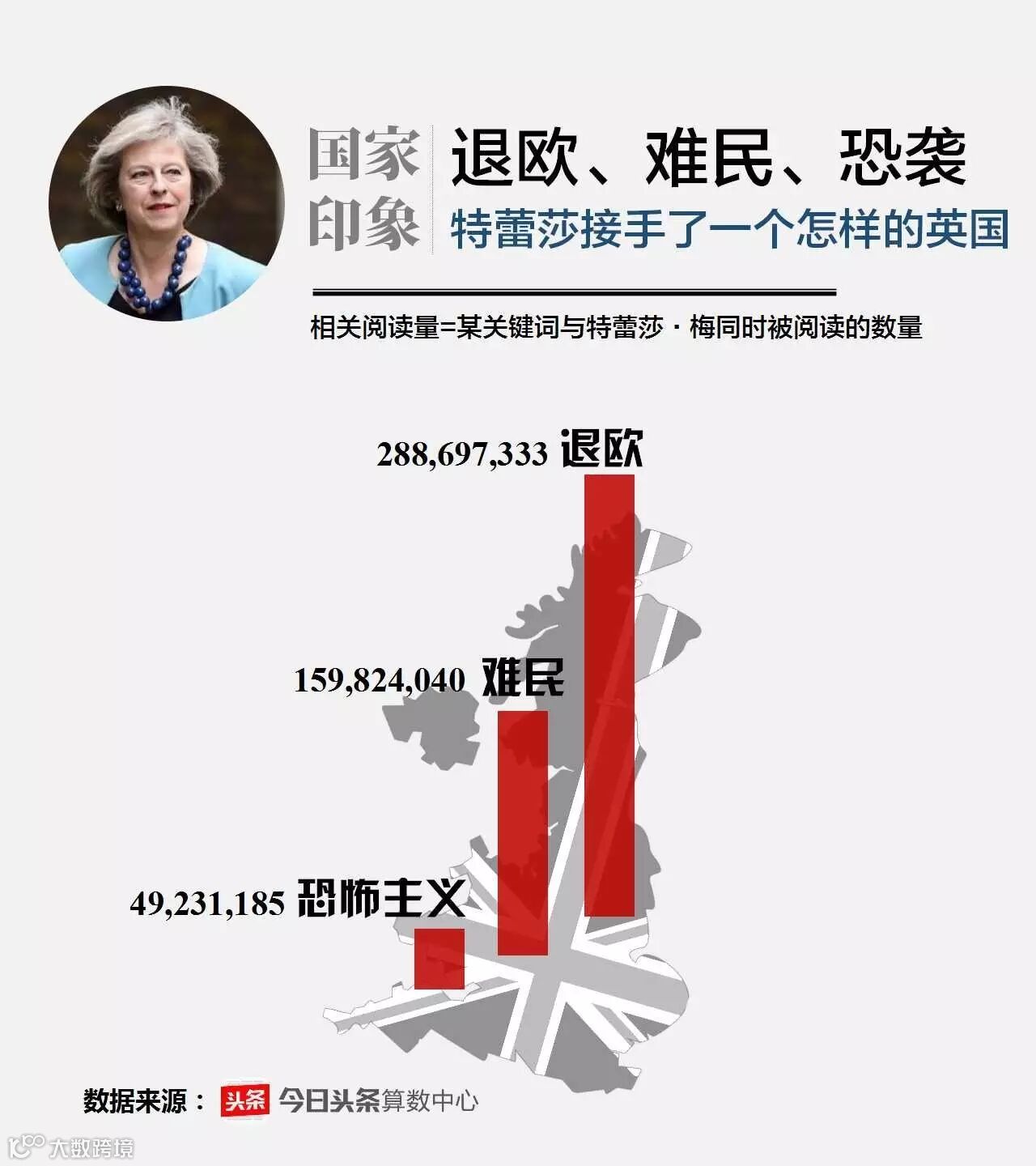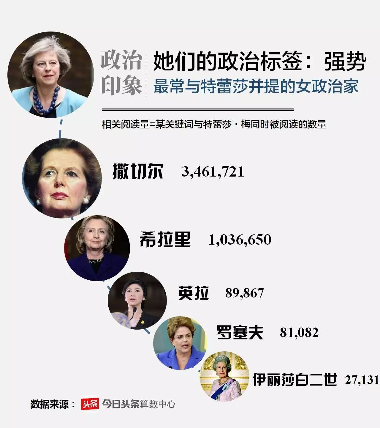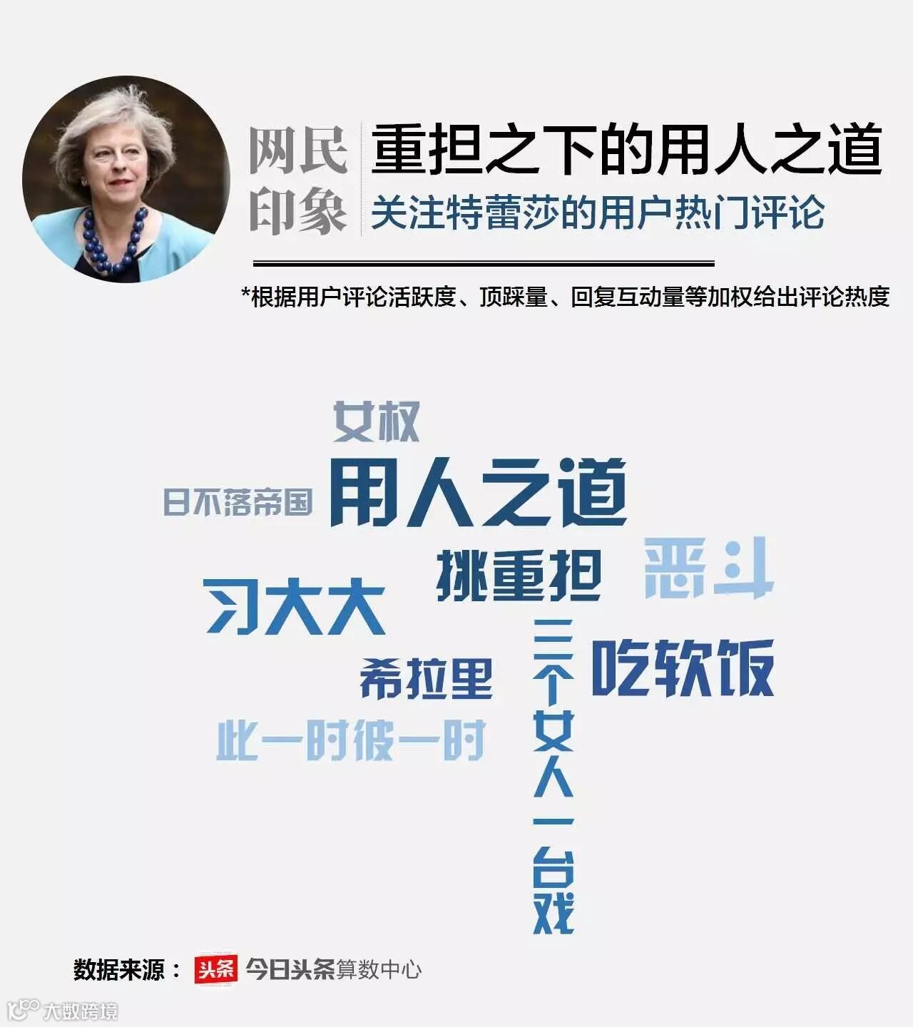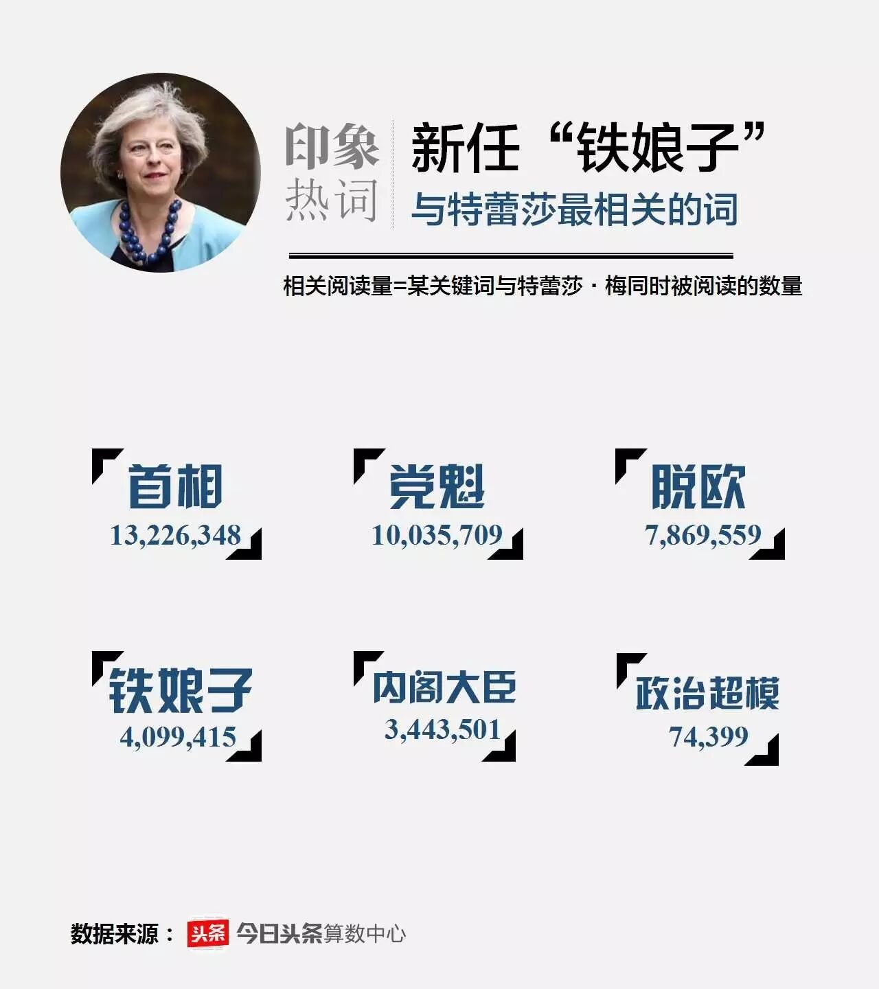 今日头条媒体实验室的数据显示,“唐宁街”、“特蕾莎·梅”都成为本日的飙升关键词。继“再见,卡梅伦”后,头条印象再次选取特蕾莎·梅作为对象,用大数据解读头条用户眼中的特蕾莎·梅。