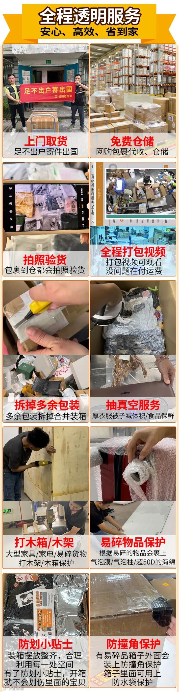 各大仓库附近,可到仓库考察,现场给你打包好,衣服/食品抽真空、打木架/木箱、易碎品气泡膜保护、防水袋、防撞角等等让你满意为止,自己看着打包也安心,更容易了解寄件出国的一些问题。一些父母给在国外留学的孩子或在国外生活的孩子寄一些东西过去,年级大了会不放心,到了现场看着我们工作人员打包,就会很安心。
