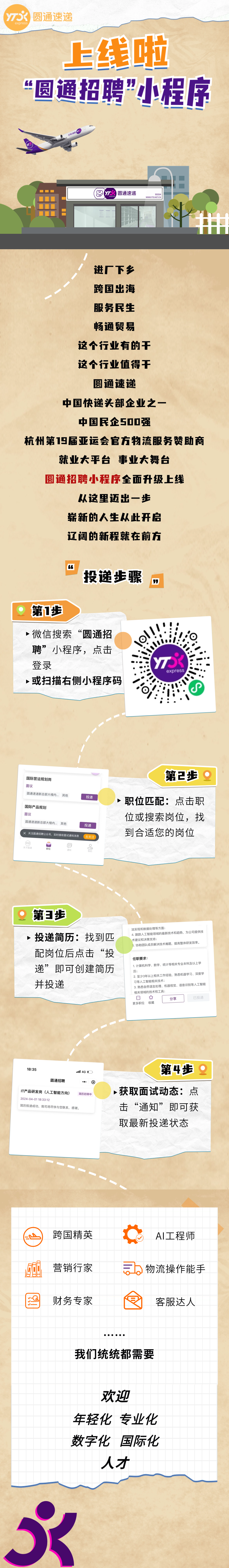 浏览小程序中的职位需求,留言说一说,你对哪个岗位比较感兴趣?我们将在所有留言中选取三位,分别送出圆通精美文创礼品一份。