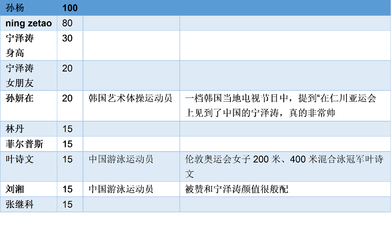 在GoogleTrends上,宁泽涛的周围同样不缺乏艳羡的目光,韩国艺术体操运动员孙妍在、中国游泳运动员都成为宁泽涛的相关人物。