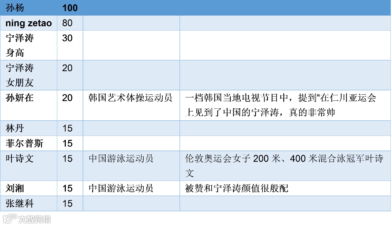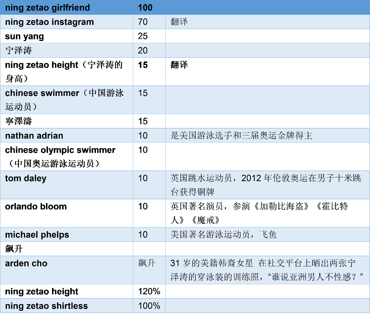 究竟是哪些国家的人对宁泽涛更感兴趣?又有哪些明星、运动员被拿来与宁泽涛相提并论?外国情敌究竟有多可怕?基于Google trends和今日头条媒体实验室,让我们以大数据来定义“宁泽涛的万众瞩目”。