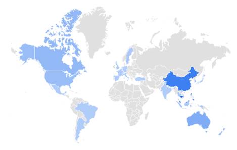 在google上搜索“ningzetao”的热度区域中,新加坡、柬埔寨、中国香港等居于前三。