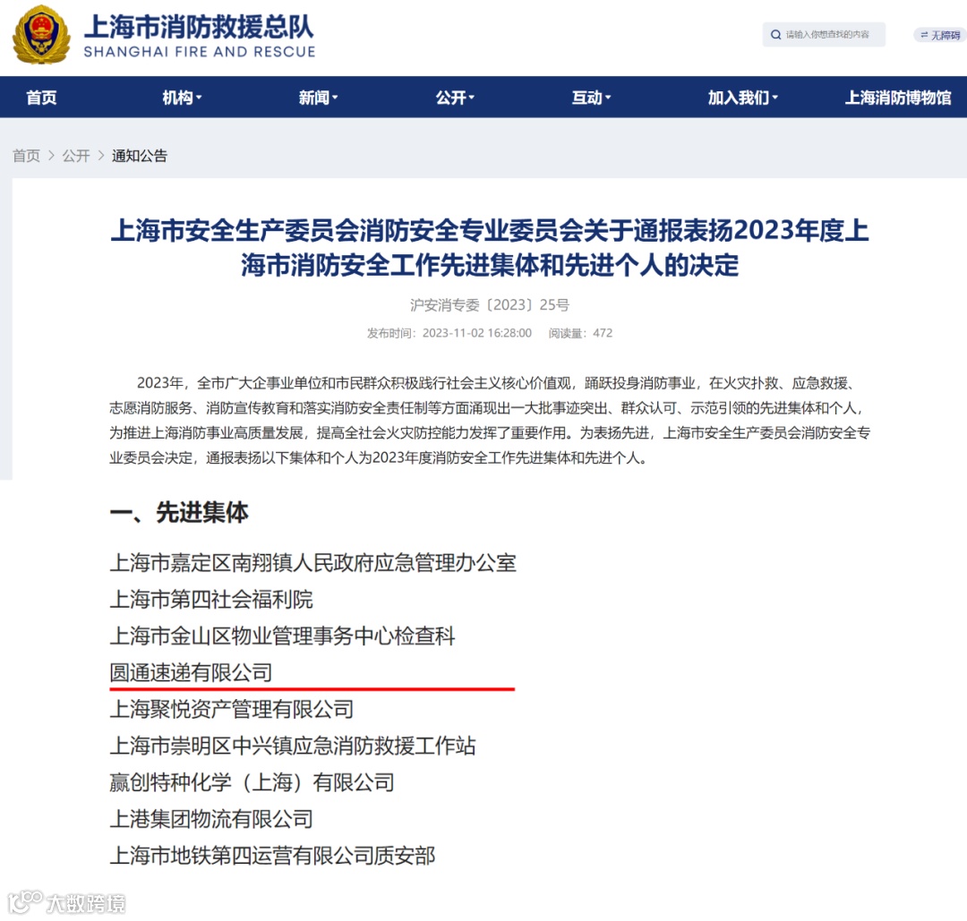 圆通速递获评上海市“2023年度消防安全工作先进集体”