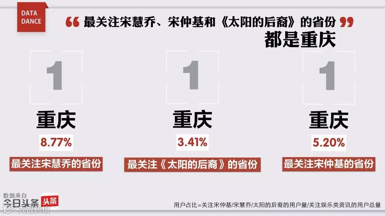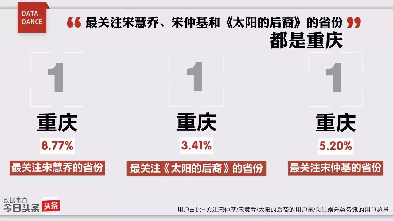 最关注宋慧乔,最关注宋仲基,最关注《太阳的后裔》的省份居然都是重庆!看来重庆的用户对《太阳的后裔》真的是爱的深沉啊。