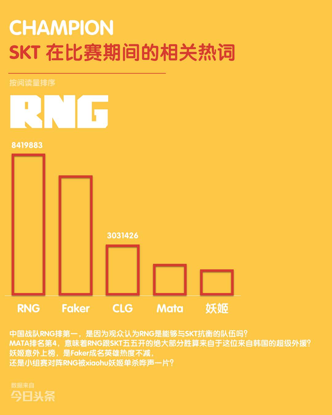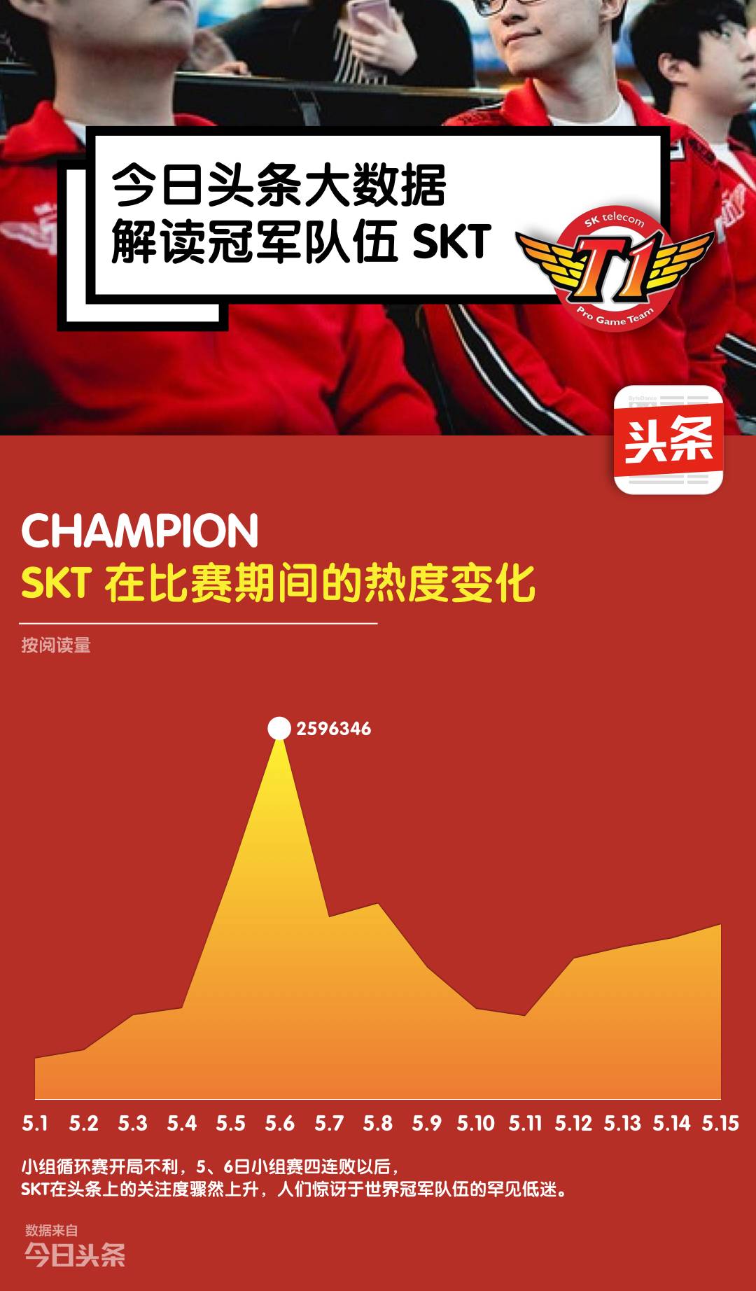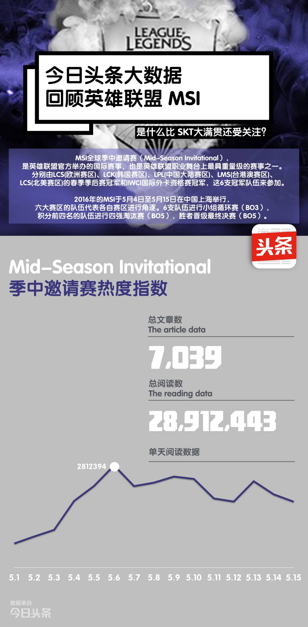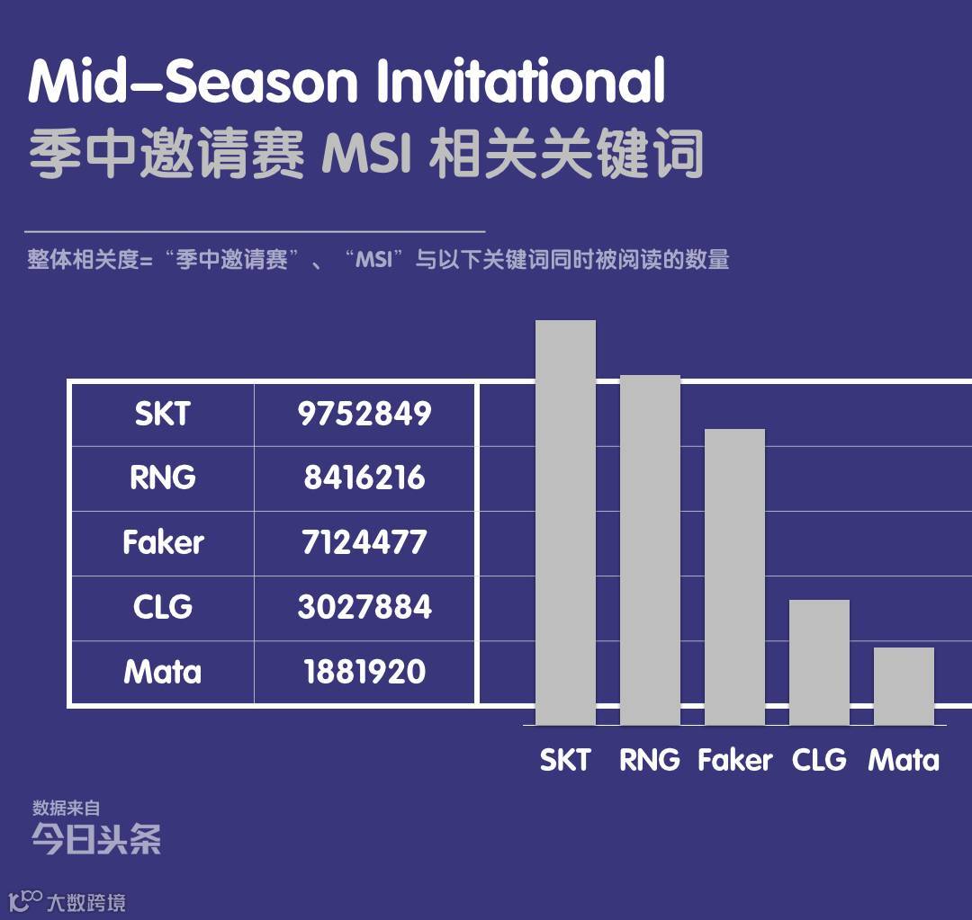 不久前,英雄联盟MSI全球季中赛在上海落下帷幕,比赛跌宕起伏,精彩纷呈,吸引了全球数千万名玩家的注意。最终来自韩国的SKT战队连续战胜了中国的RNG战队和北美的CLG战队,获得冠军也载入史册,完成了英雄联盟所有大型国际赛事的大满贯!不过,在本次MSI全球季中赛中,SKT获得大满贯好像并不是最受关注的话题点。看头条大数据来趣味解读本次MSI!