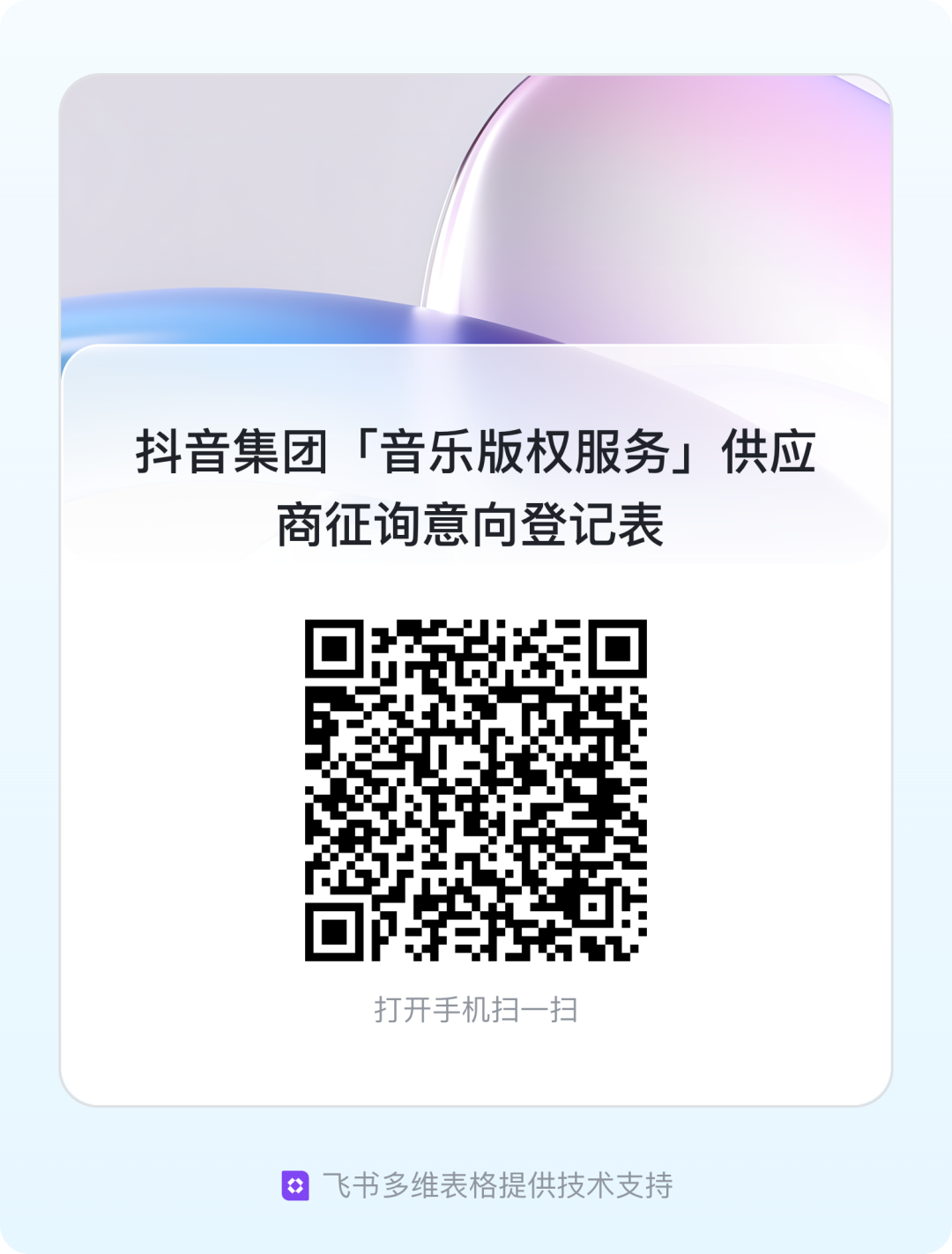 抖音集团启动音乐版权服务合作供应商公开征询,本次供应商征询面向社会公开渠道寻源优质供应商,服务内容包含但不限于音乐版权服务(含音乐作品著作权人确权、版权使用许可洽谈、授权文件签署等)、版权风险核查(音乐作品侵权风险评估、已有授权合规性审查等)、版权管理支持(授权期限跟踪、版权文件归档管理、后续版权续期对接等)、特殊场景版权解决方案(如跨界合作音乐使用、线下活动背景音乐授权、直播场景音乐合规使用等),具体供应商资质能力要求参考以下信息。