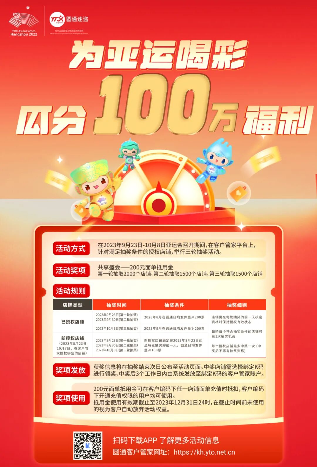 作为杭州第19届亚运会官方物流服务赞助商,圆通将在杭州亚运会举办期间(9月23日—10月8日),为我们的客户带来亚运专属福利!