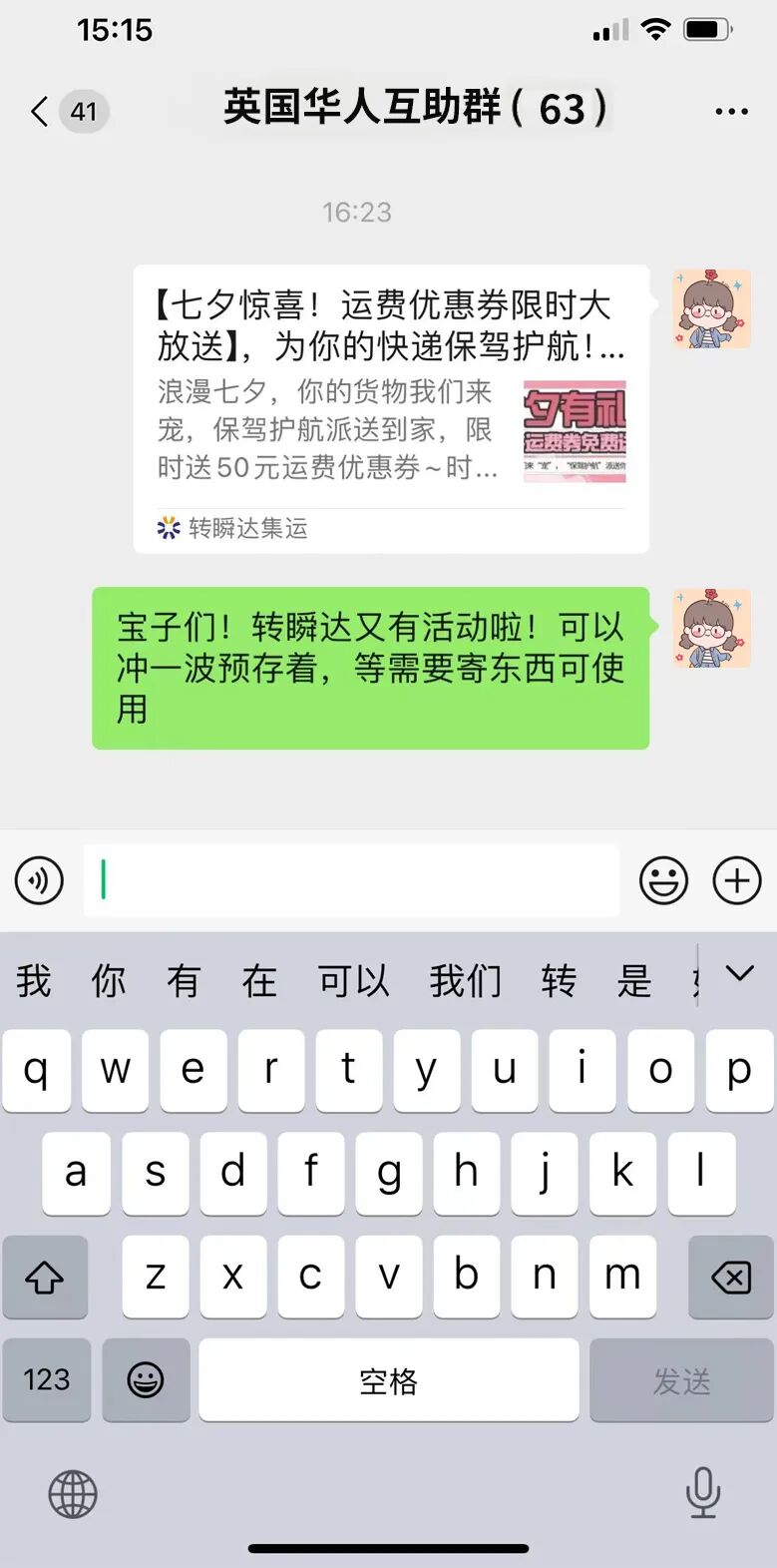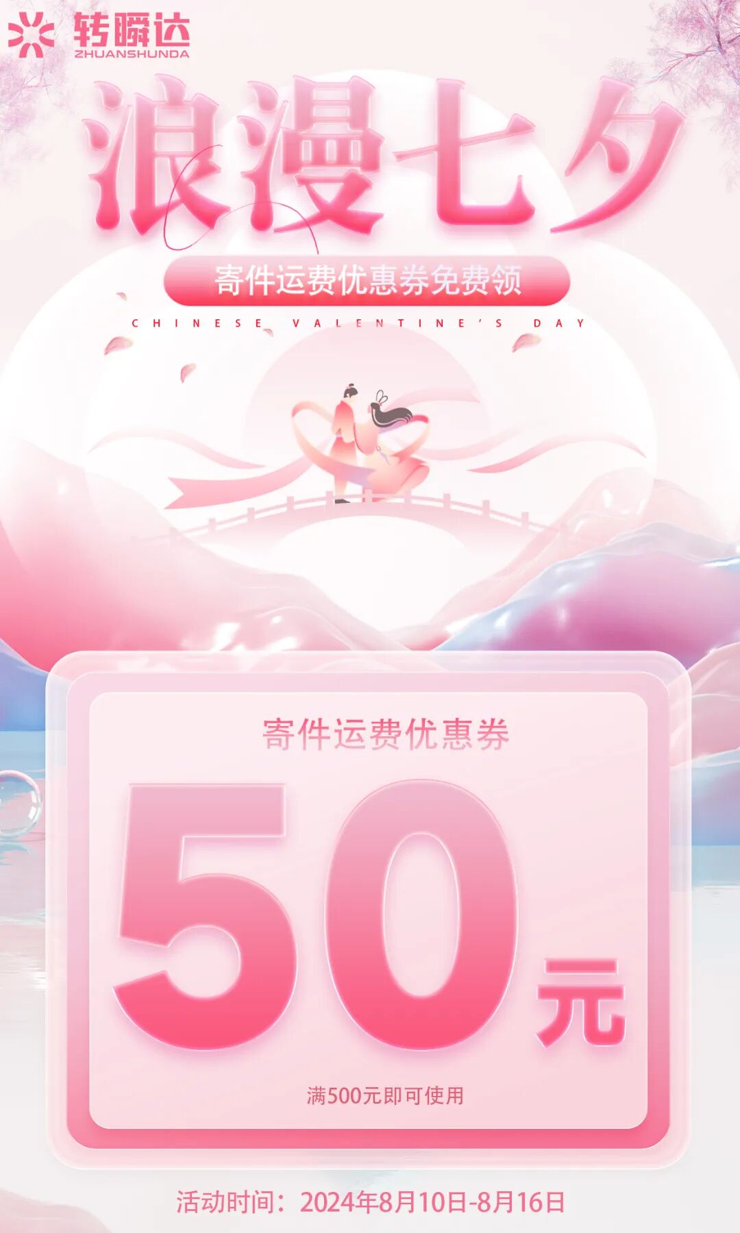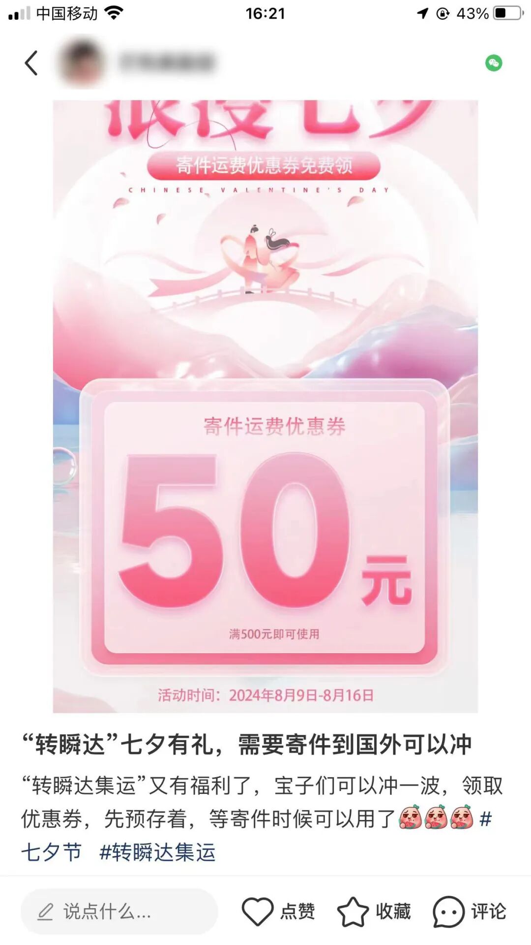 第三种:分享活动海报以“转瞬达集运”为主题“文案自行编辑”到小红书或抖音上。24小时后截图给客服即可获得满500减50优惠券;
