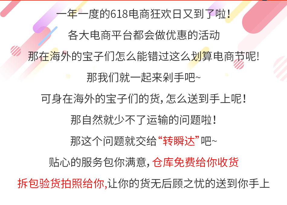 导读:“618又快到啦”国内电商各种优惠活动,在海外的宝子们是不是也要趁一波优惠活动囤货呢~那和【转瞬达集运】一起剁手囤货!您的货交给我们,【转瞬达】助你的货邮到家