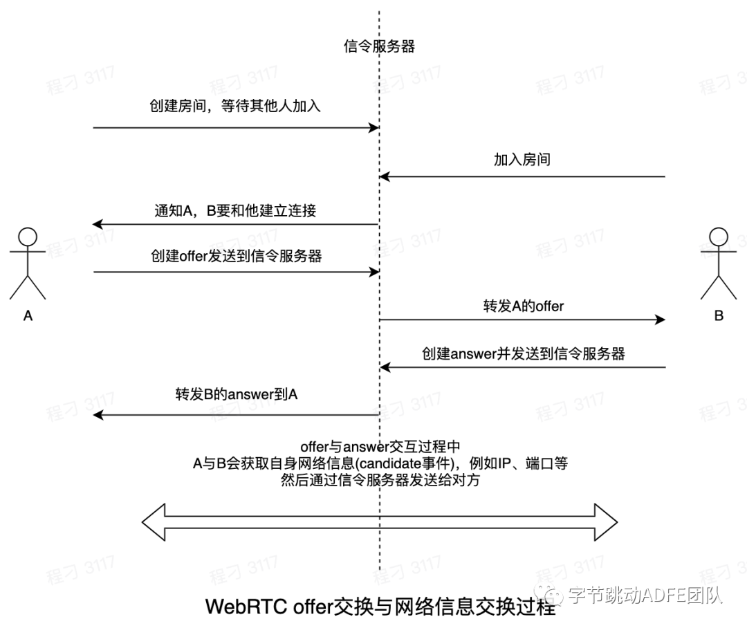 A 与 B 在建立连接的 WebRTC 连接过程中,需要互相知道对方的 IP 与通信端口。那么 A 与 B 要如何知道对方的 IP 与端口呢?答案就是通过信令服务器。信令服务器的作用是作为一个中间人帮助双方在尽可能少的暴露隐私的情况下建立连接。