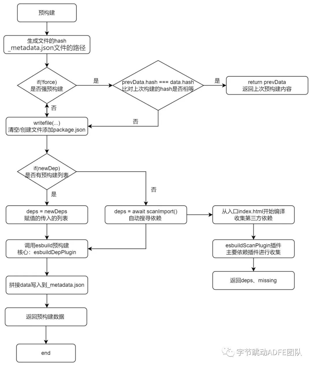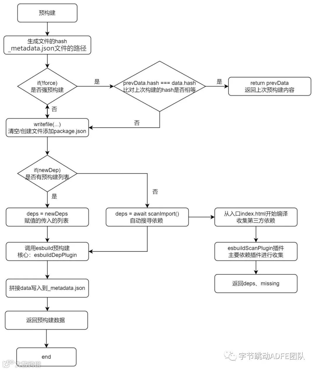 optimizeDeps()主要是根据配置文件生成hash,获取上次预购建的内容(存放在_metadata.json文件)。如果不是强预构建就对比_metadata.json文件的hash和新生成的hash:一致就返回_metadata.json文件的内容,否则清空缓存文件调用Esbuild构建模块再次存入_metadata.json文件