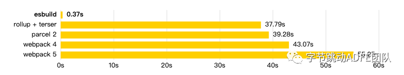 这是Esbuild首页的图。新一代的打包工具,提供了与Webpack、Rollup、Parcel 等工具相似的资源打包能力,但在时速上达到 10~100 倍的差距,耗时是Webpack2%~3%