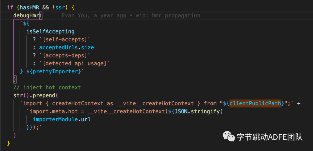 客户端:当我们配置了热更新且不是ssr的时候,Vite底层在处理 html 的时候会把HMR相关的客户端代码写入在我们的代码中,如下: