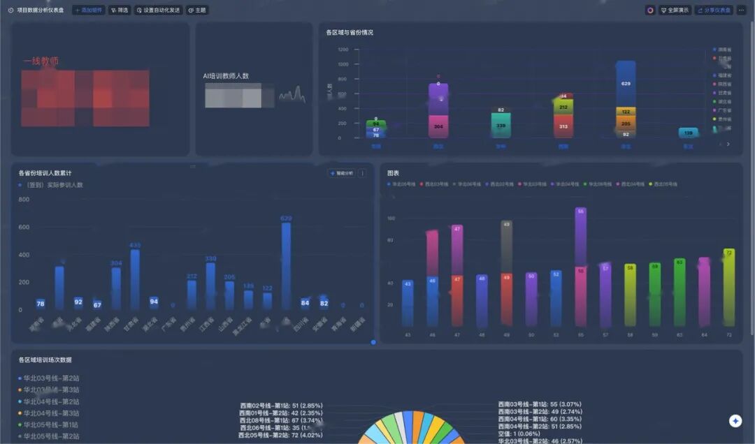 真爱梦想的教师培训项目规模庞大,尤其是每年暑期,需要动员大学生志愿者、退休教师等组成小队,深入区县,开展为期 1-2 周的集中培训。他们通过飞书多维表格构建了完整的项目工作流,确保两三千名教师的培训有序进行:从前期立项、项目知识沉淀、学校分布管理,到培训场次安排、人员匹配、执行进展跟踪,再到最终的结项反馈,全程都在一张表里。