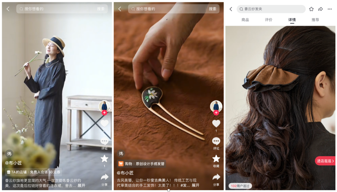 新锐设计品牌「布小匠」则更懂年轻人的心思,在他们的直播间里,香云纱不再只是成衣,还变成了发簪、发带、居家布艺等小物件。设计师边演示搭配边讲解设计理念,让年轻消费者也能轻松体验多样化的非遗好物。
