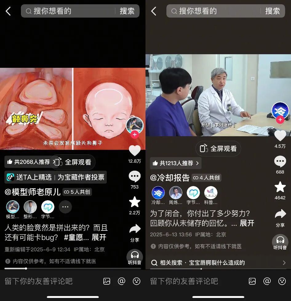 科普创作者@模型师老原儿 与@整形医生马希达 ,在抖音合作发布了唇腭裂科普视频《人类的脸竟然是拼出来的?而且还有可能卡bug?》。视频中4~8孕周的人类胚胎的发育过程被制作成放大的模型,直观展示每一周的变化,其中第六周被称作“黄金窗口期”,如果母亲在这时遭遇烟草攻击、病毒的感染、药物的侵袭,就可能造成面部结构融合异常,出现唇腭裂。视频中马希达医生提醒观众,唇腭裂也是可以修复的,“唇腭裂不等于智力缺陷,修复一定要抓住黄金期,孕前应补充叶酸,远离烟酒,避免滥用药物”,视频在抖音点赞量达12万。