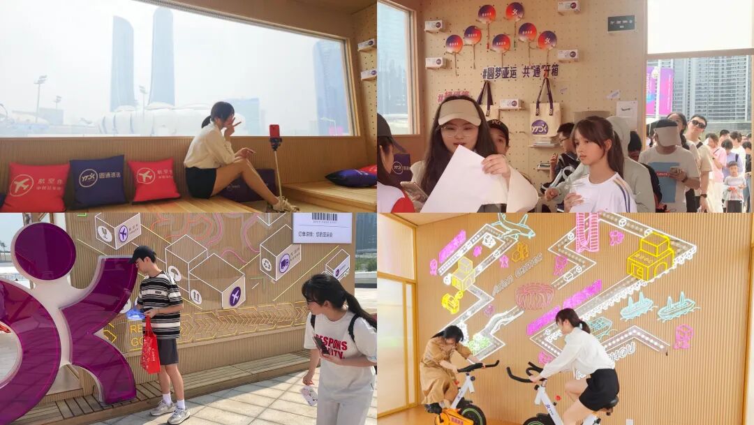 空运、陆运、海运、集运中心、快递网络……在“超级箱”展厅内的一面墙上,通过LED灯路线图的方式展现了圆通为亚运提供的多式联运的国际化全链路物流保障,并通过互动单车的发电装置让展厅观众亲自“体验”圆通是如何保障亚运赛事物流服务的。展厅另一面的巨型窗户将此次亚运的另一个主要场馆——“小莲花”完整展现在眼前,是圆通专为观众而设的一个绝佳取景框。不少打卡观众戏称在这里拍出了自己的“人生照片”。贴心的圆通工作人员还在现场准备了照片打印机,为观众们留下与亚运的美好回忆。