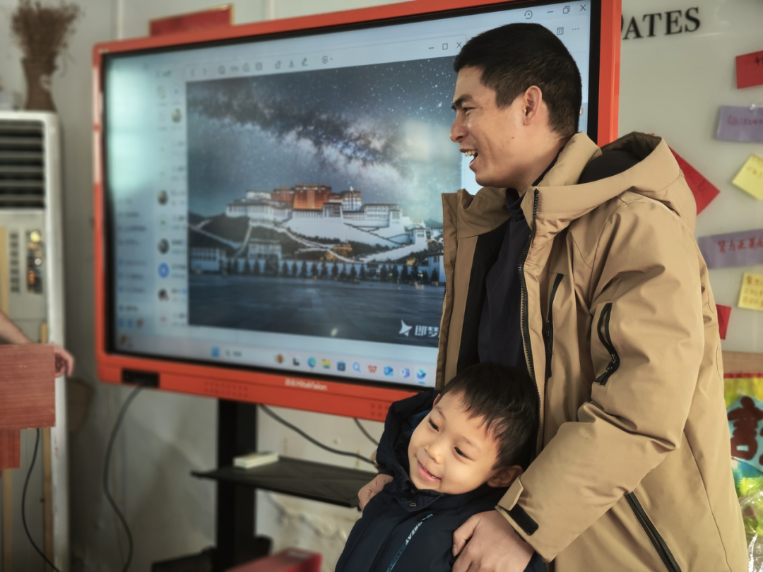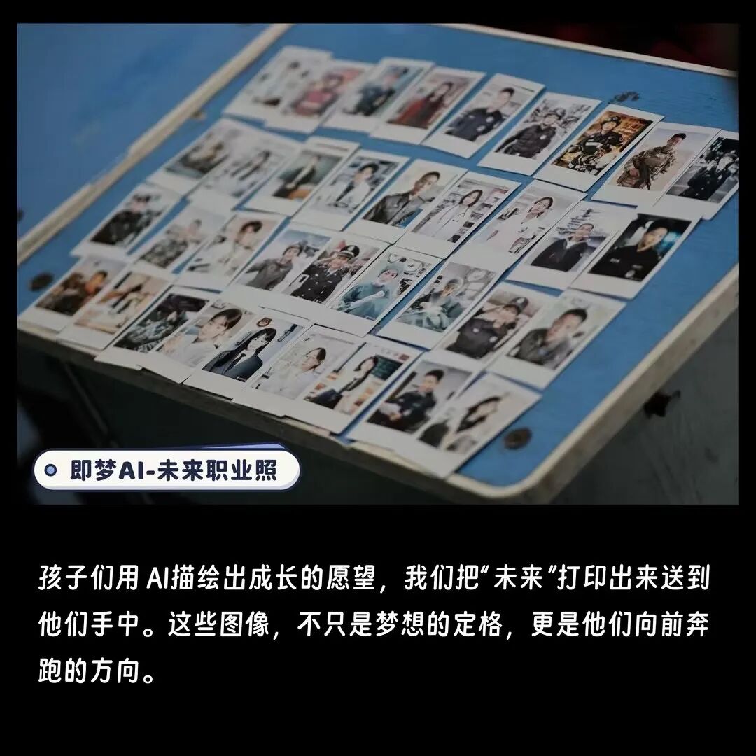 孩子们把杜校长层层包围,手里举着自己的照片给他看。照片是孩子们使用AI生成的20年后的自己,在字节跳动志愿者的帮助下完成,这也是如新送给孩子们的儿童节礼物。