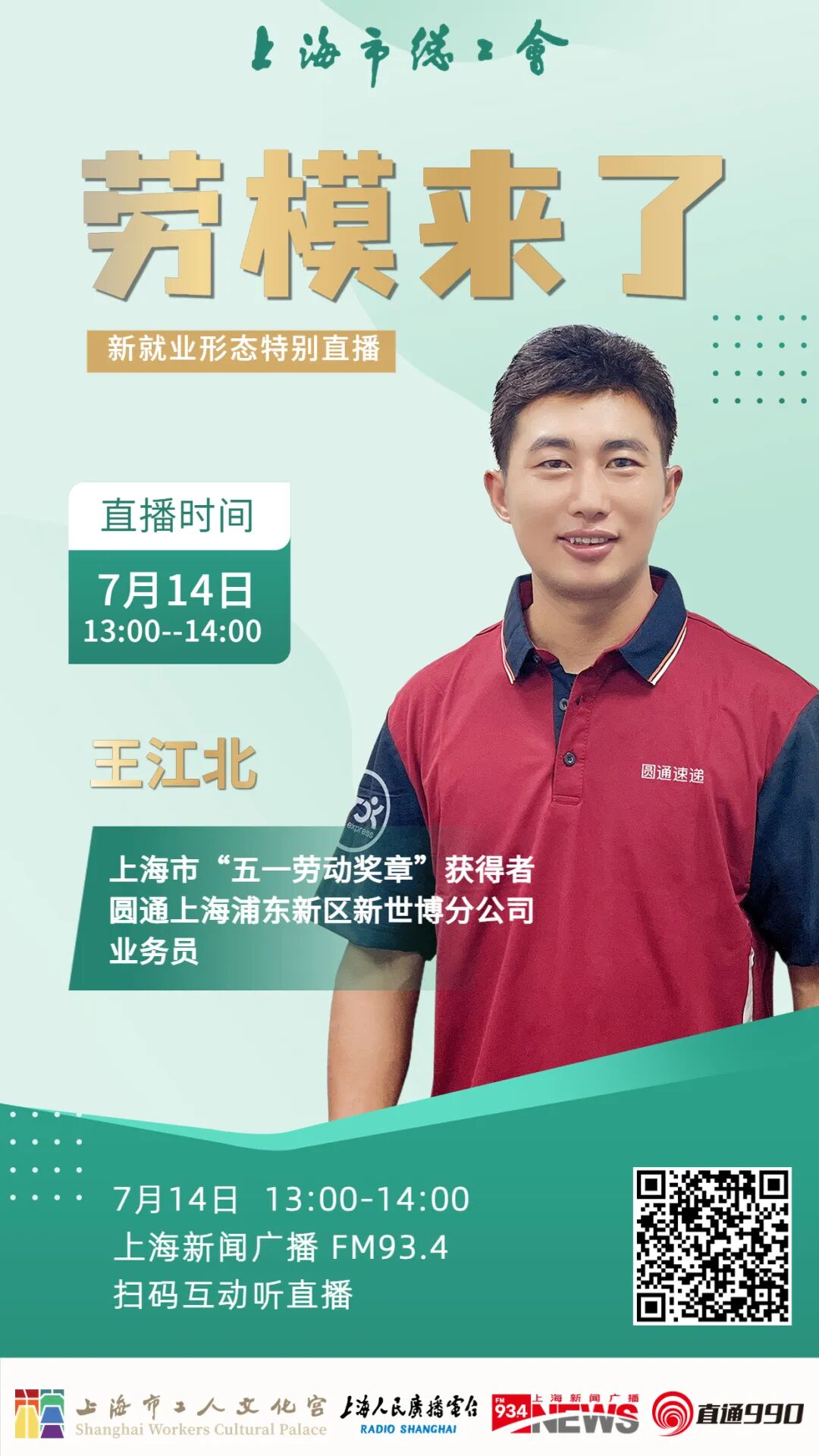 7月14日13:00-14:00,“劳模来了”新就业形态特别直播,邀请上海市“五一劳动奖章”获得者、圆通速递上海浦东新区新世博分公司业务员王江北做客直播间,欢迎收听。