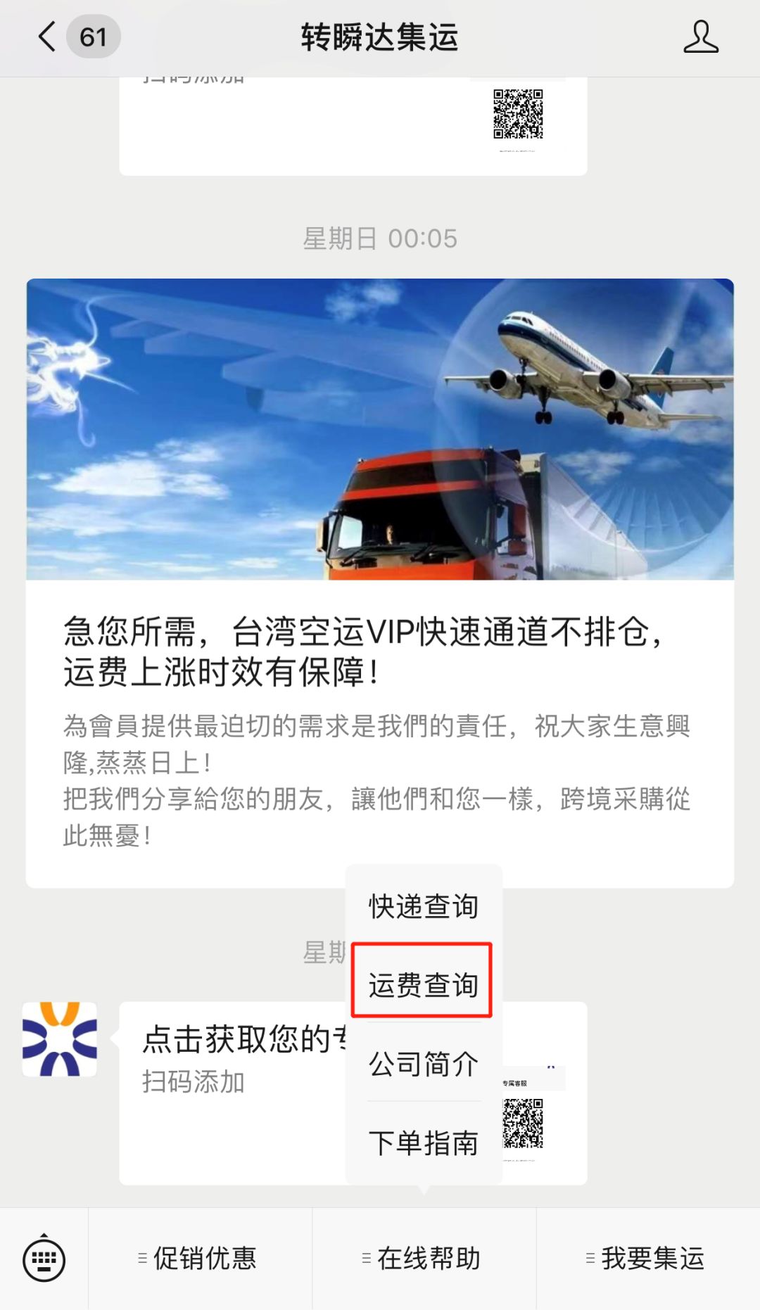 进入【转瞬达集运】公众号页面,点击下方的菜单栏【在线帮助】;