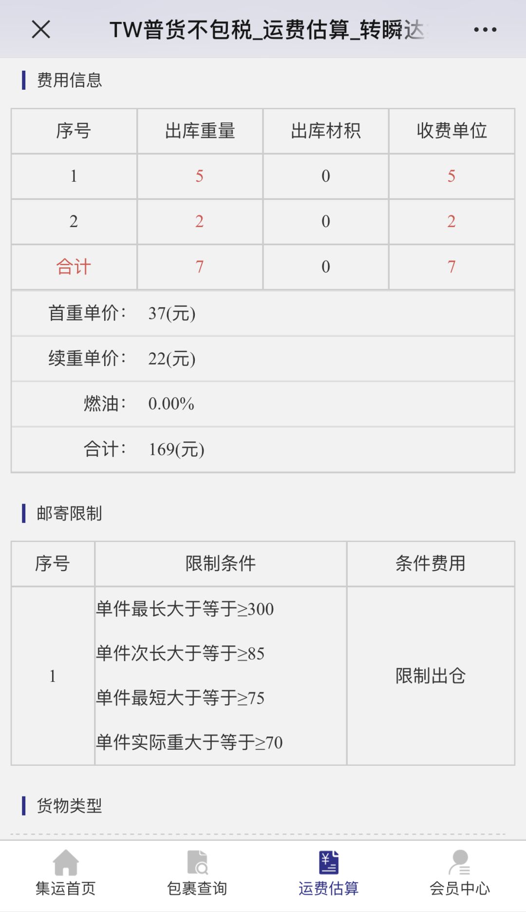 点击进入可以看到更详细的费用信息、邮寄限制等。