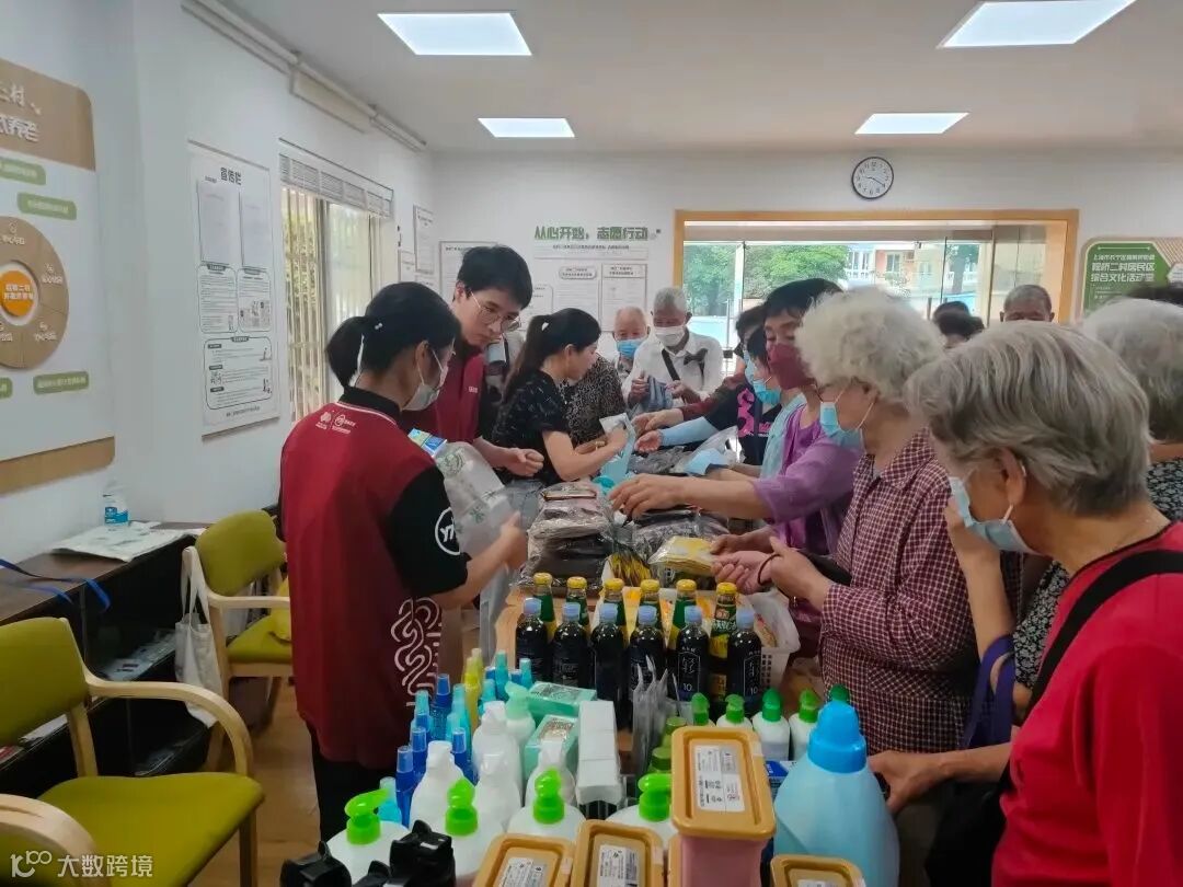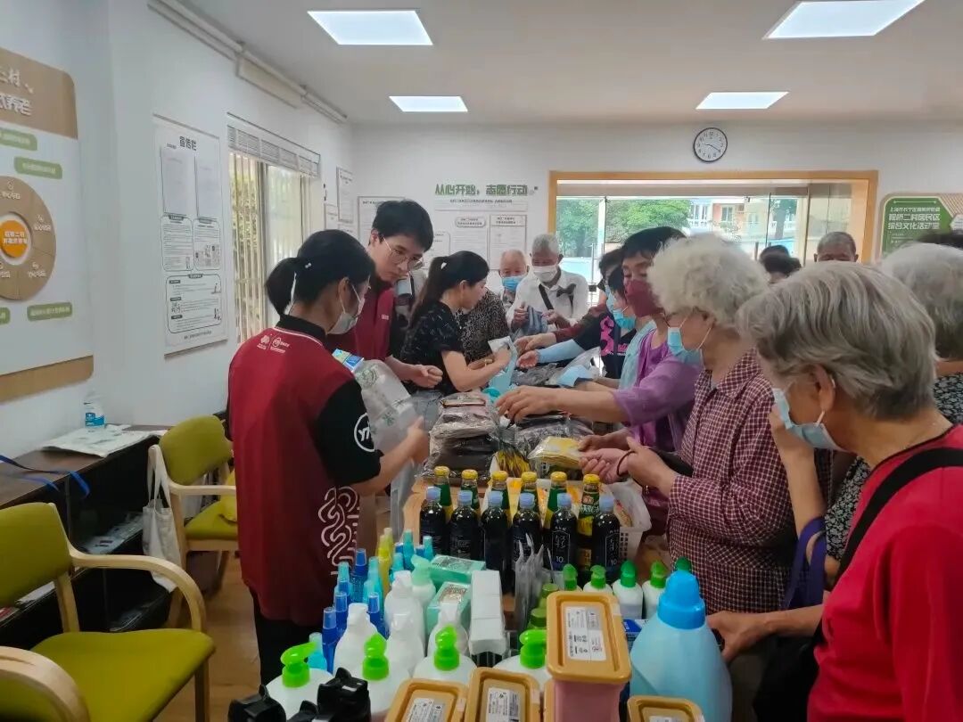 “爱心集市”活动现场,售卖的物品种类丰富——夏日防护用品、洗护用品、调味品、日常用品等等,圆通小哥们也客串了一回营业员,有的介绍产品、有的负责收款,还有的负责帮老人把购买的商品送到家。大家纷纷排起了长队,前来购买咨询的老年居民们络绎不绝,现场井然有序,热闹非凡。