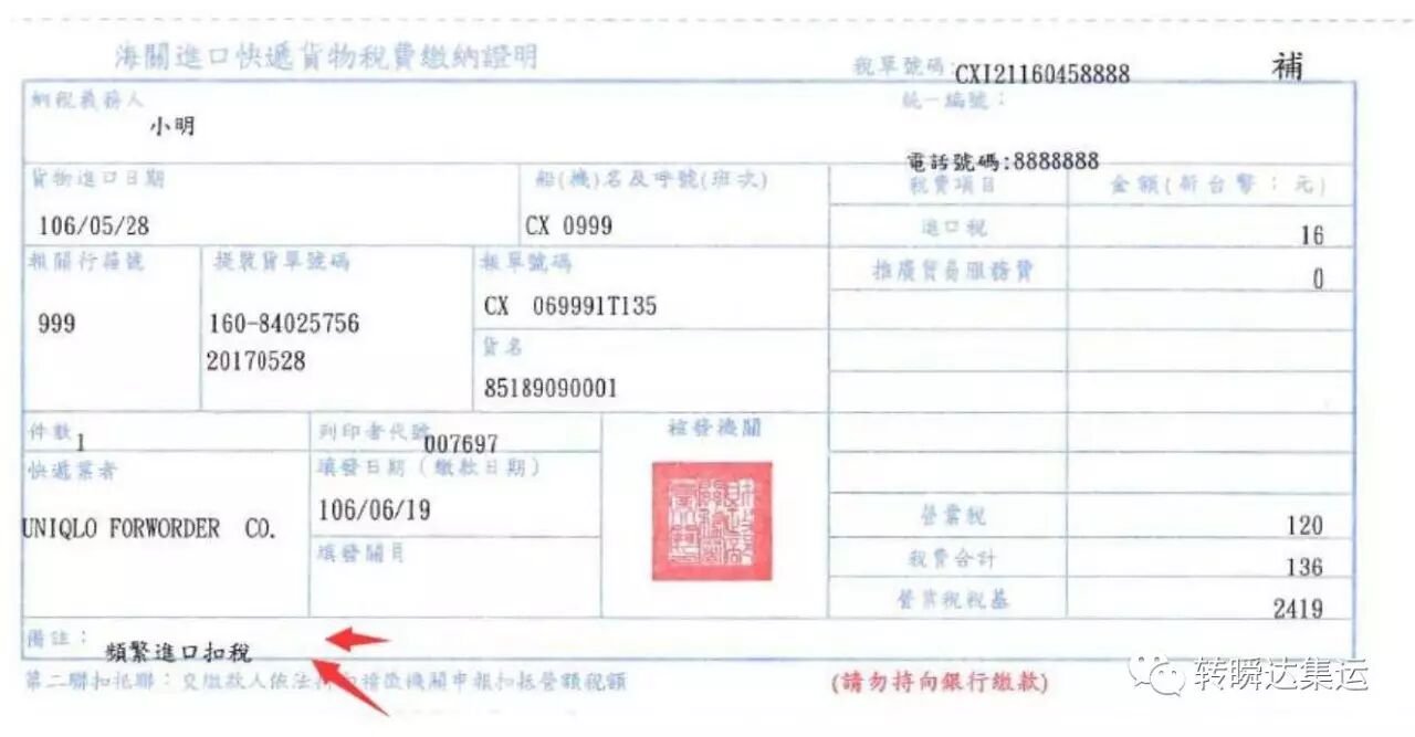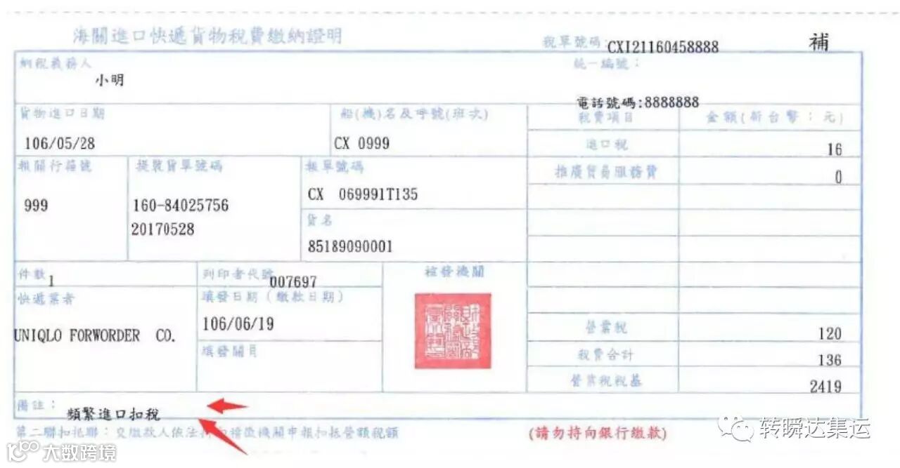 收貨人拿到稅費收據時,怎麼知道是因為超過免稅限額被課稅?還是因為進口次數頻被課稅?如下圖: