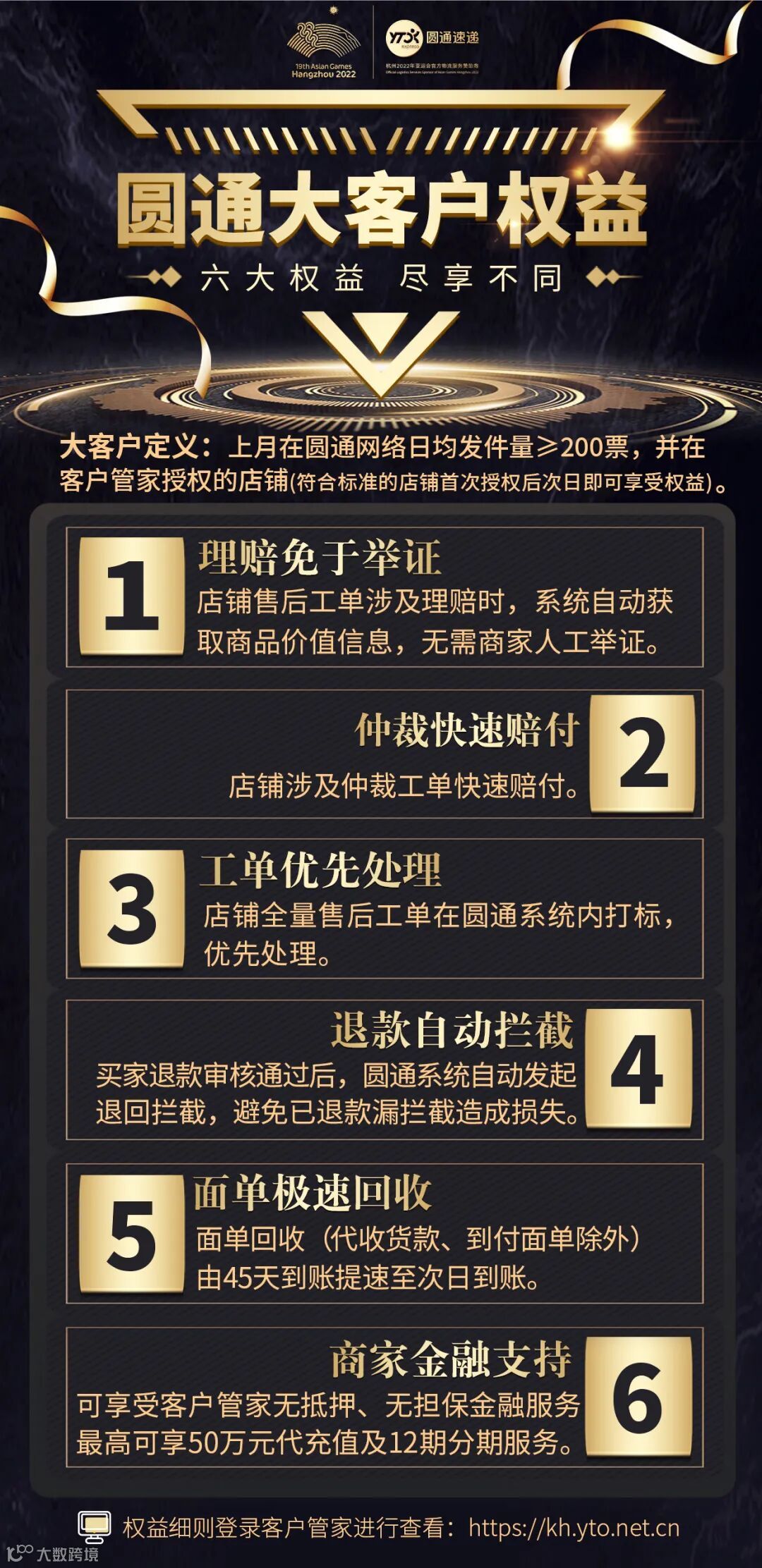 今年2月,圆通面向全网电商客户推出差异化营销产品——“大客户权益”:即圆通“客户管家”的绑定店铺,只要在圆通日均发件量≥200票,最快次日即可享受圆通为其打造的6大专属权益(详情请见海报)。上线一个多月时间,包括石先生在内的黄浦圆通超60%的客户就享受到了。