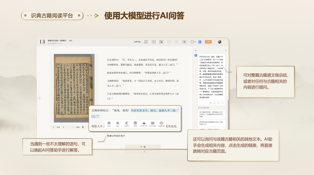 在阅读平台上,大语言模型技术能够有效帮助用户理解古籍。当使用者遇到疑难问题时,可唤起AI助手答疑解惑;对于部分古籍,使用火山引擎提供的豆包大语言模型,可自动提取古籍中的实体关系,全局俯瞰古籍中的人物、地点等时空关系;依托火山引擎方舟MaaS平台,可实现文言文到白话文的翻译。无论对于专业研究人员还是社会大众,都能有效提升对于古籍阅读、理解、研究、利用的效率。