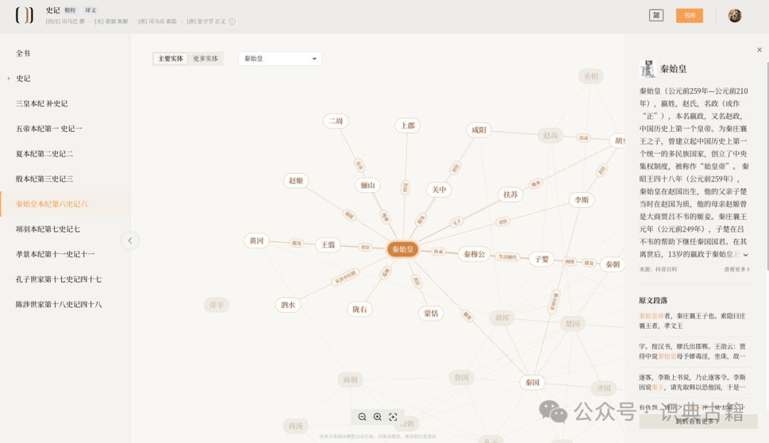 在“识典古籍”上阅读古籍,完全免费、不需要登录、不限IP、不限制复制字数、全部资源皆可全文通搜。在此基础上,我们也希望借助人工智能技术,辅以学者校对,实现用新技术来利用古籍的知识。目前在部分古籍上探索的,包括在标记古籍中的人名、地名、时间之后,将它们对应到百科词条、公元年以及地图上的地理位置;以及通过实体关系图等方式,概览性地从古籍中寻找自己感兴趣的部分。最终,希望能服务广大读者、研究者,让大家能用现代化的方式高效利用传统文化资源。