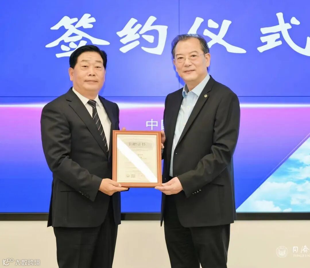 ▲同济大学党委常委、副校长雷星晖为喻渭蛟董事长送上捐赠证书,感谢他和圆通集团对同济大学的大力支持,对教育事业的积极贡献。