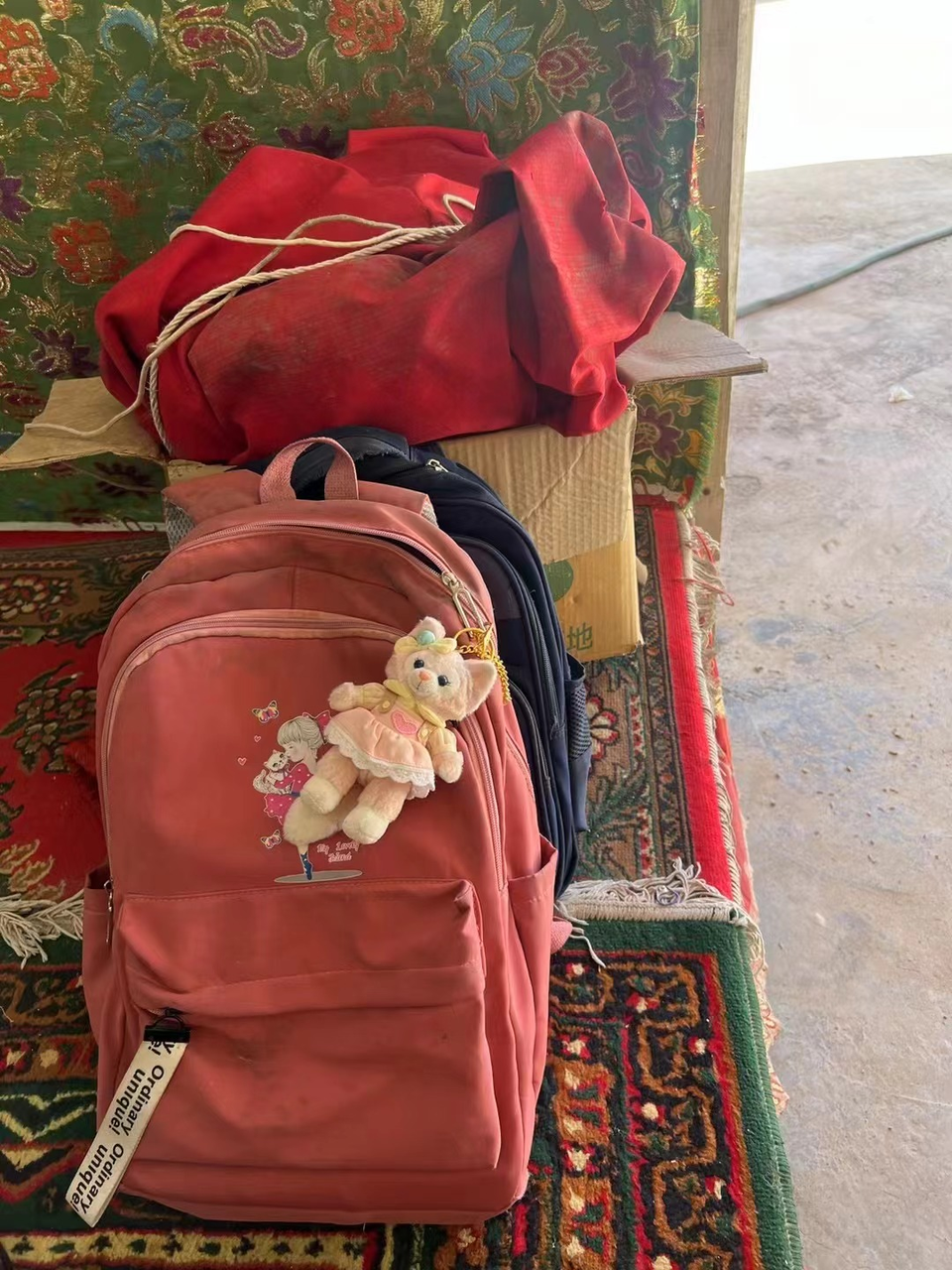 跟视频里展现的一样,离开新疆那天,我去那个女孩家跟她道别。她不在家出去踢球了,但她们家窗户是破的。我从窗户看进去,有一个粉色书包,上面躺着我送她的那个玲娜贝尔挂件。那一幕对我来说很震撼。她的书包旧旧的,上面这只玲娜贝尔是我朋友从上海迪士尼排长队买来送我的限量版挂件。