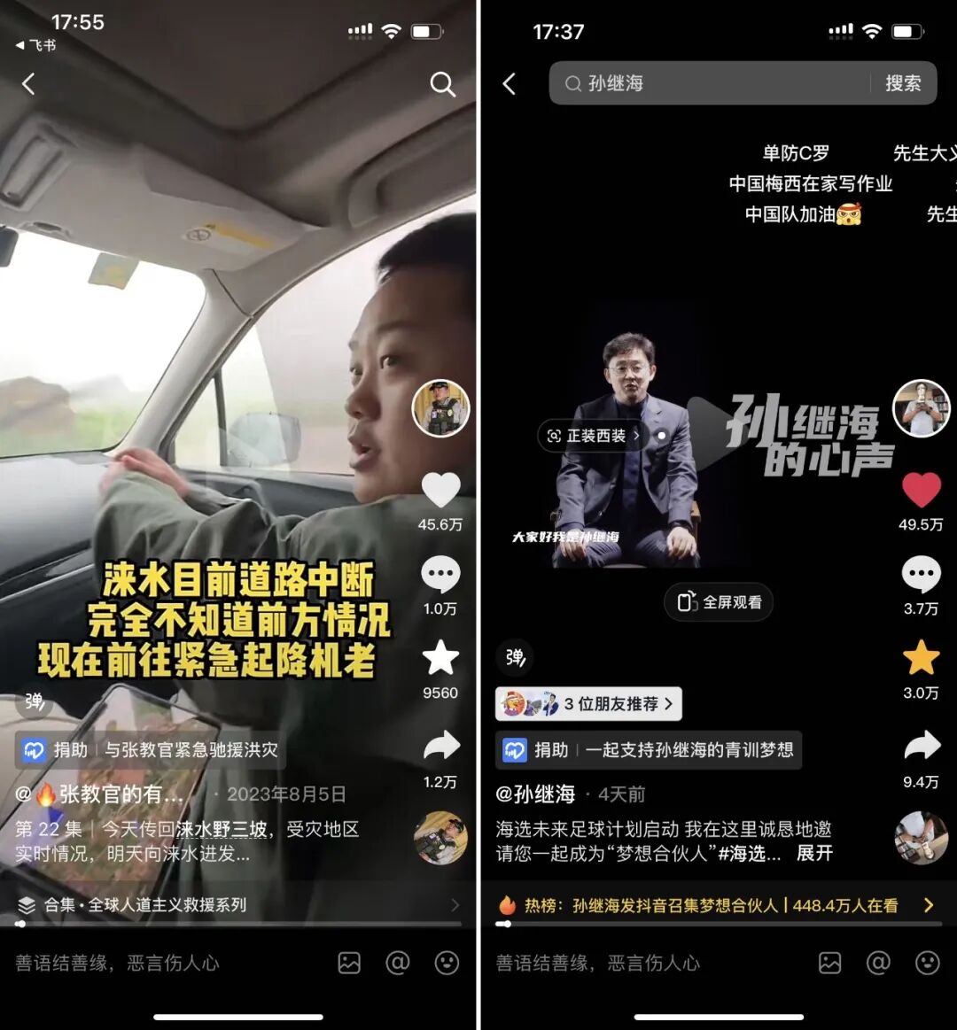 还有更多抖音高粉创作者集结着爱心网友的力量,让大众将目光投向各个角落:@张教官的有趣人生 在“与张教官紧急驰援洪灾”行动中通过短视频记录参与涿州暴雨一线救援真实画面,4条视频累计播放破亿,带动了大量网友关注与支持;@蛋解创业 推出了“蛋解筑梦计划”,与粉丝们共同“承包”了湖北黄冈一个班级52位学生3年的助学金资助。@孙继海、 @厨房历险记 等创作者也就各自关注的公益领域持续发声,用短视频、线下探访等形式呼吁网友的关注参与。