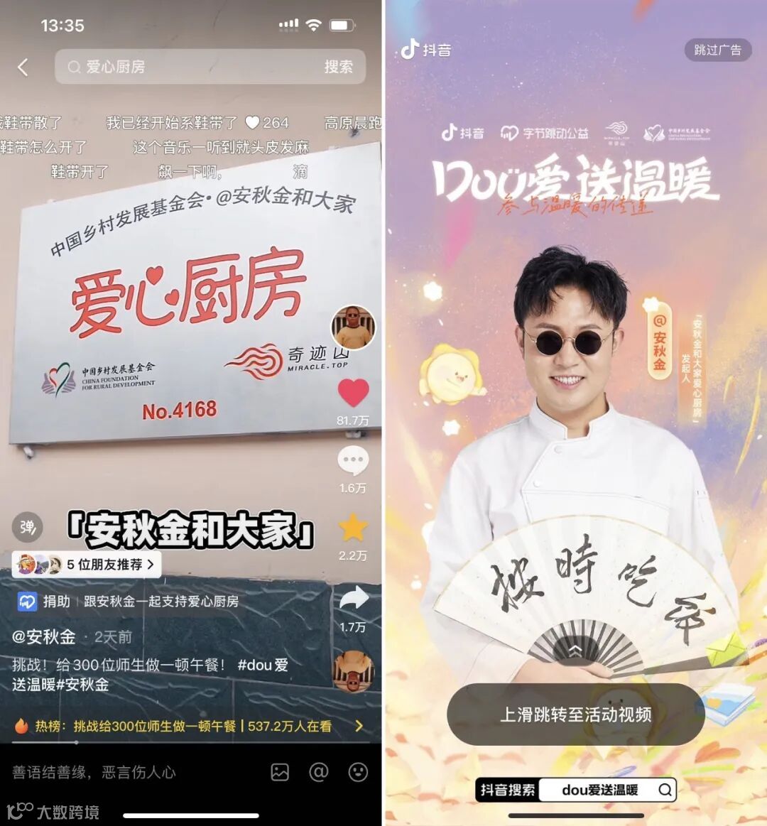 如在2023年12月dou爱送温暖活动期间,@安秋金 与中国乡村发展基金会共同发起的公益专项,就引超了过1.9万人次捐助,共筹款80万元,可以为更多乡村儿童修建12个爱心厨房,用崭新、专业的厨房设备保障乡村学校的众多孩子们吃上热乎营养的饭菜。