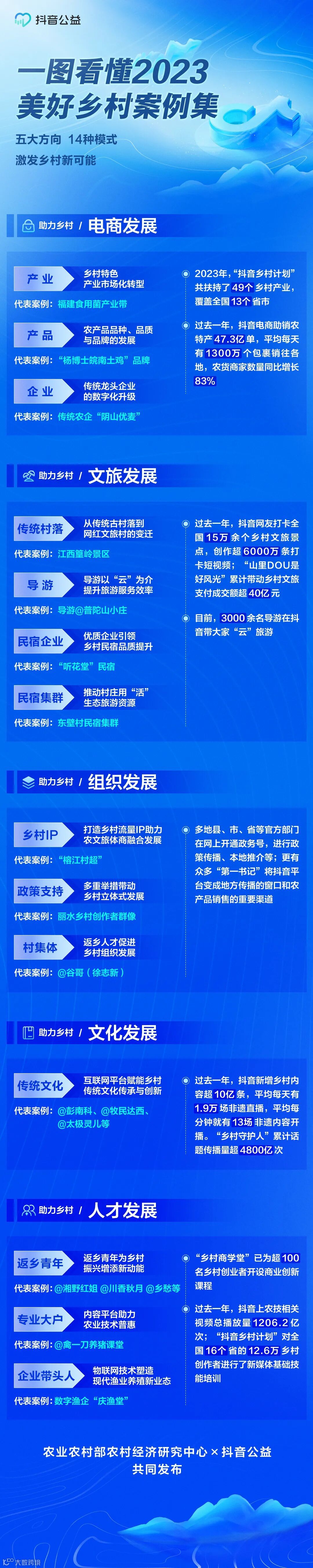 论坛中,农业农村部农村经济研究中心联合抖音公益发布了《激发乡村新可能·美好乡村案例集》。该案例集汇编14种数字时代乡村发展的典型模式案例,提炼了当下美好乡村创新发展的多维可能和实践路径,以期为广大乡村建设者提供参考和借鉴。