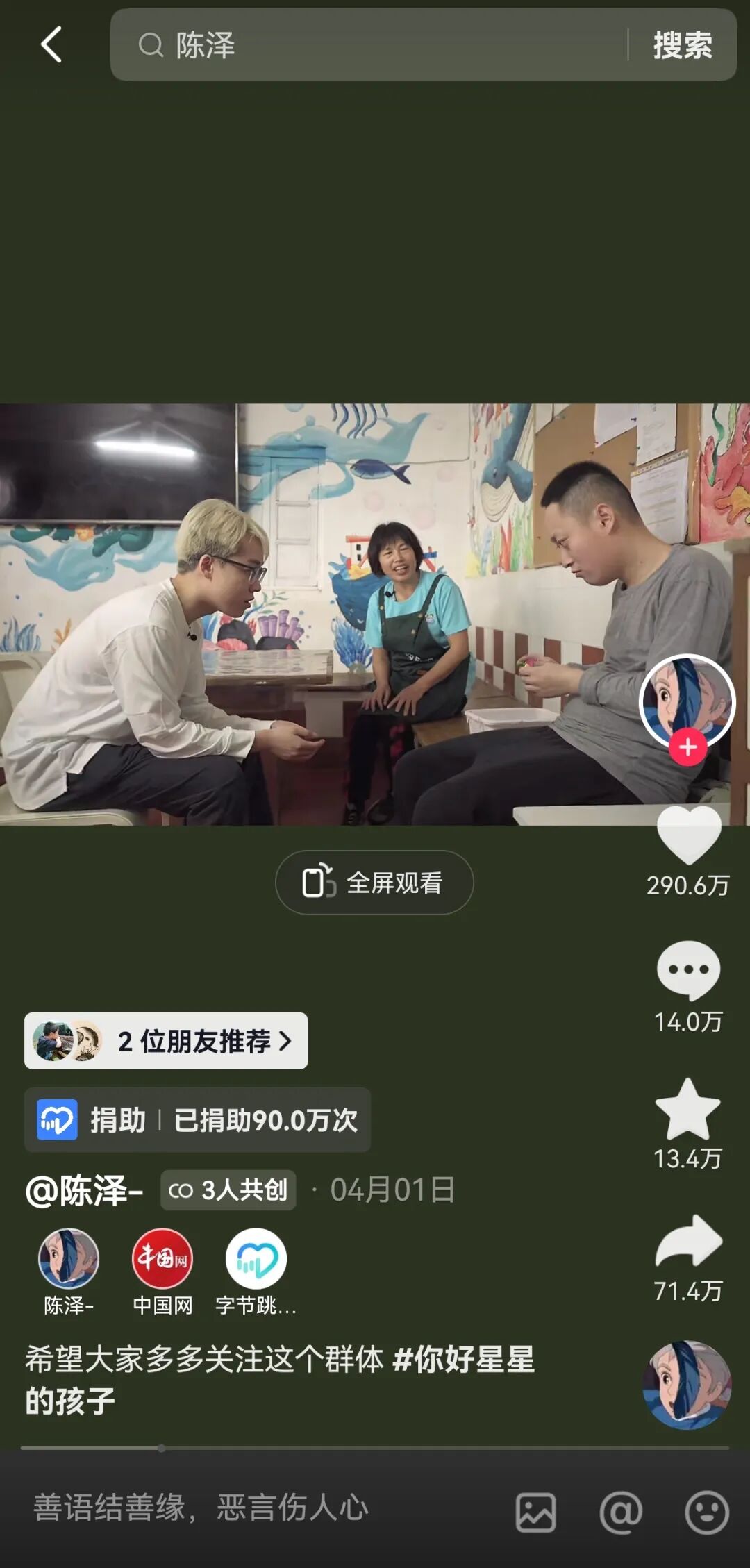 陈泽将自己在慧灵农场的一天拍摄为《让我走近特别的你》公益短片,呼吁更多人接纳孤独症群体,为他们创造友好的社会环境。短片在抖音获得300多万次点赞互动,并为帮助心智障碍儿童成长的公益专项——海洋天堂计划筹集41.6万元善款。他的粉丝纷纷在视频下留言,有人分享自己与孤独症朋友相处的经历,有人亮出自己参与公益捐赠的证书,有一位捐完款的粉丝写道:“虽然微不足道,但我相信一切都会变好。”