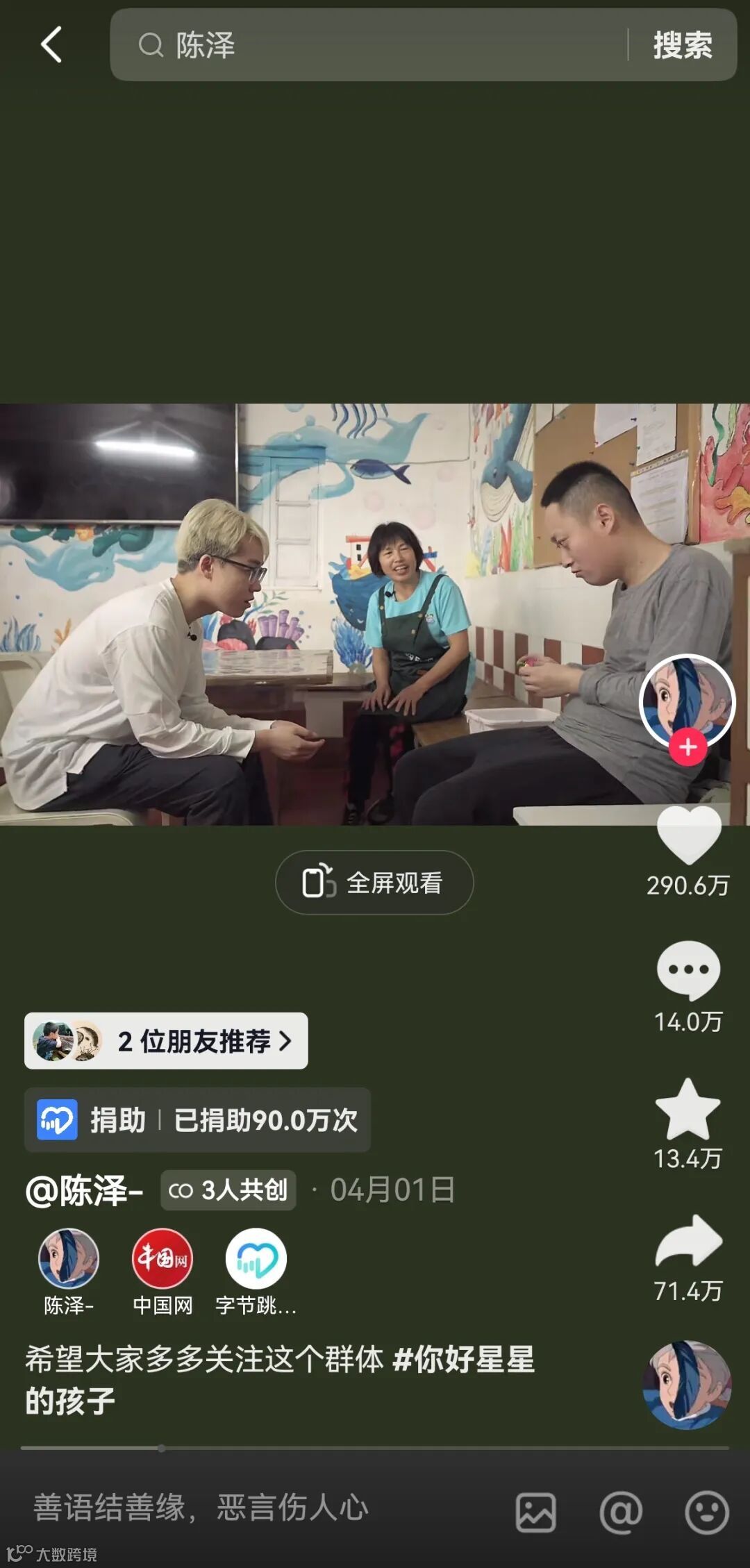 在这次疗愈之旅后,陈泽也希望今后尽可能多在字节跳动公益平台,主动走近和连接需要关爱和帮助的群体,发出属于自己的公益之声。